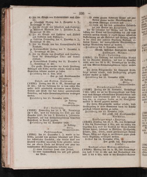 Hoffmann. Gilmer. Brod Lieferung. (1234) Die Lieferung des erforderlichen Brodes für die Garniſon Friedberg, auf das 1. Semeſter 1839, wird den 29. d. M., Vormittgas um 10 Uhr, auf dem Militär⸗Verwaltungsbüreau dahier verſtei⸗ gert. ö Die Herrn Bürgermeiſter der Umgegend Fried⸗ bergs werden erſucht, dieſe Verſteigerung geeignet bekannt machen zu laſſen. Friedberg den 15. November 1838. In Auftrag: Gölz,