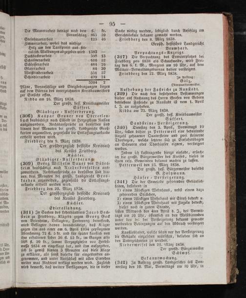 Pläne, Voranſchläge und Steigbedingungen liegen auf dem Büreau des unterzeichneten Kreisbaumeiſters zur Einſicht offen. Nidda am 16. März 1838. Der großh. heſſ. Kreisbaumeiſter Süffert. Gläubiger- Aufforderung. (306) Kaspar Gruner von Obererlen⸗ bach beabſichtigt nach Ellfeld im Herzogthum Naſſau auszuwandern. Rechtsanſprüche an denſelben ſind binnen drei Monaten bei großh. Landgericht Groß— karben anzumelden, gegenfalls die Entlaſſungsurkunde ertheilt werden wird. Friedberg den 9. März 1838. Der großherzoglich heſſiſche Kreisrath des Kreiſes Friedberg. Küchler. Gläubiger⸗ Aufforderung (309) Georg Wilhelm Bauer von Büdes⸗ heim beabſichtigt nach Niederdorfelden aus⸗ zuwandern. Rechtsanſprüche an denſelben ſind bin⸗ nen drei Monaten bei großh. Landgericht Gros⸗ karben anzumelden, gegenfalls die Entlaſſungs— urkunde ertheilt werden wird. Friedberg den 20. März 1838. Der großherzoglich heſſiſche Kreisrath des Kreiſes Friedberg. Küchler. Edictalladung. (311) In Sachen des Lederhändlers Jacob Bech— ſtein zu Friedberg, Klägers gegen Georg Geck von Beienheim, Beklagten, Forderung betreffend, wird Beklagter davon benachrichtigt, daß Kläger gegen ihn aus einer am 6. April 1834 gepflogenen Abrechnung 72 fl. 5 kr. und für ſpäter käuflich von ihm erhaltenes Leder 36 fl. 15 kr., im Ganzen alſo 108 fl. 20 kr., ſammt Verzugszinſen von Herbſt⸗ meſſe 1834 an eingeklagt hat, und ihm aufgegeben, ſich ſo gewiß binnen 3 Monaten auf dieſe Klage zu erklären, als ſonſt dieſelbe für eingeſtanden an— genommen, und unter Ausſchluß mit allen Einreden weiter was Rechtens verfügt werden wird. Zugleich wird bemerkt, daß weitere Verfügungen, die in dieſer