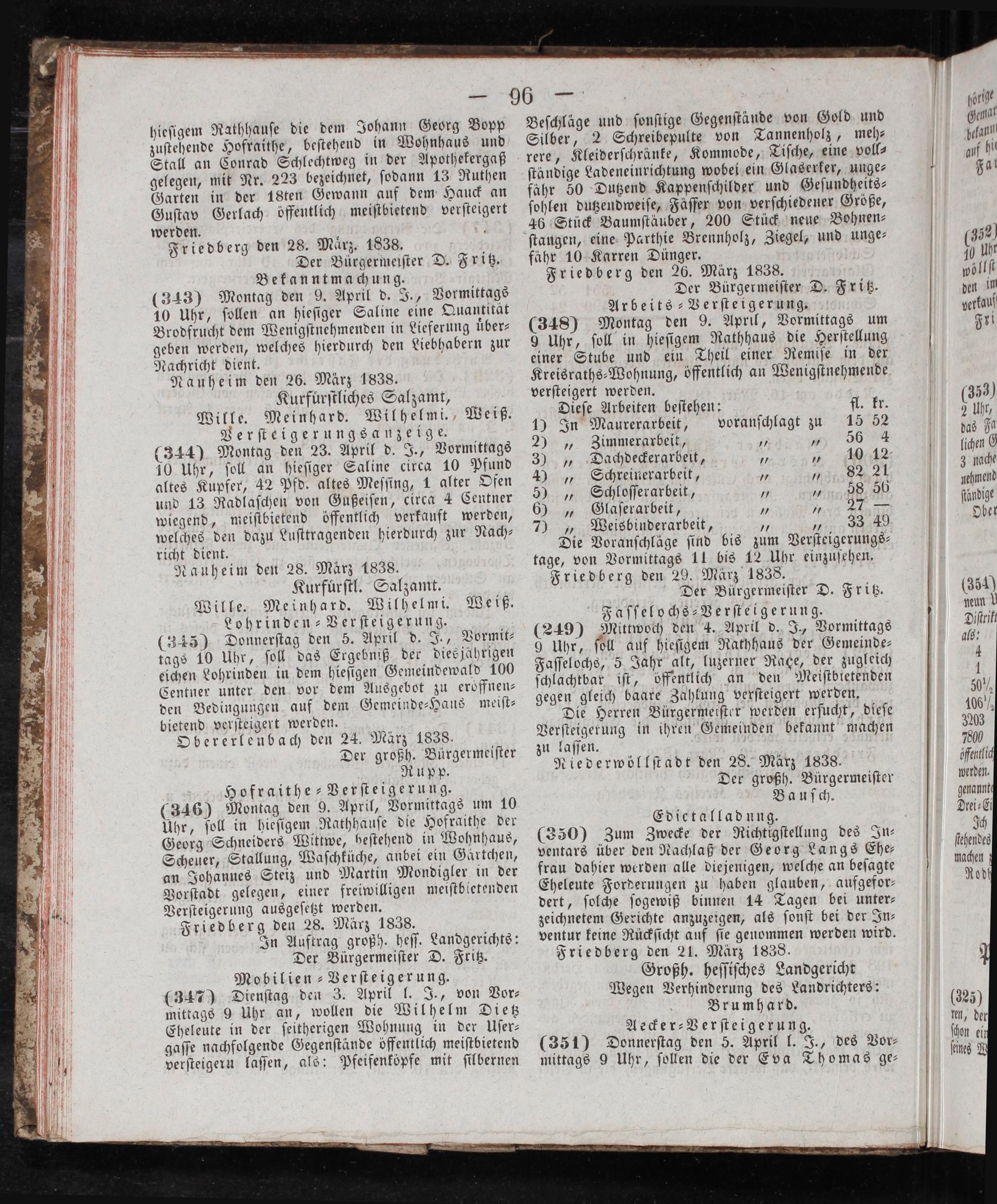 auheim den 26. März 1838. Kurfuͤrſtliches Salzamt, Wille. Meinhard. Wilhelmi. Weiß. Verſteigerungsanzeige.