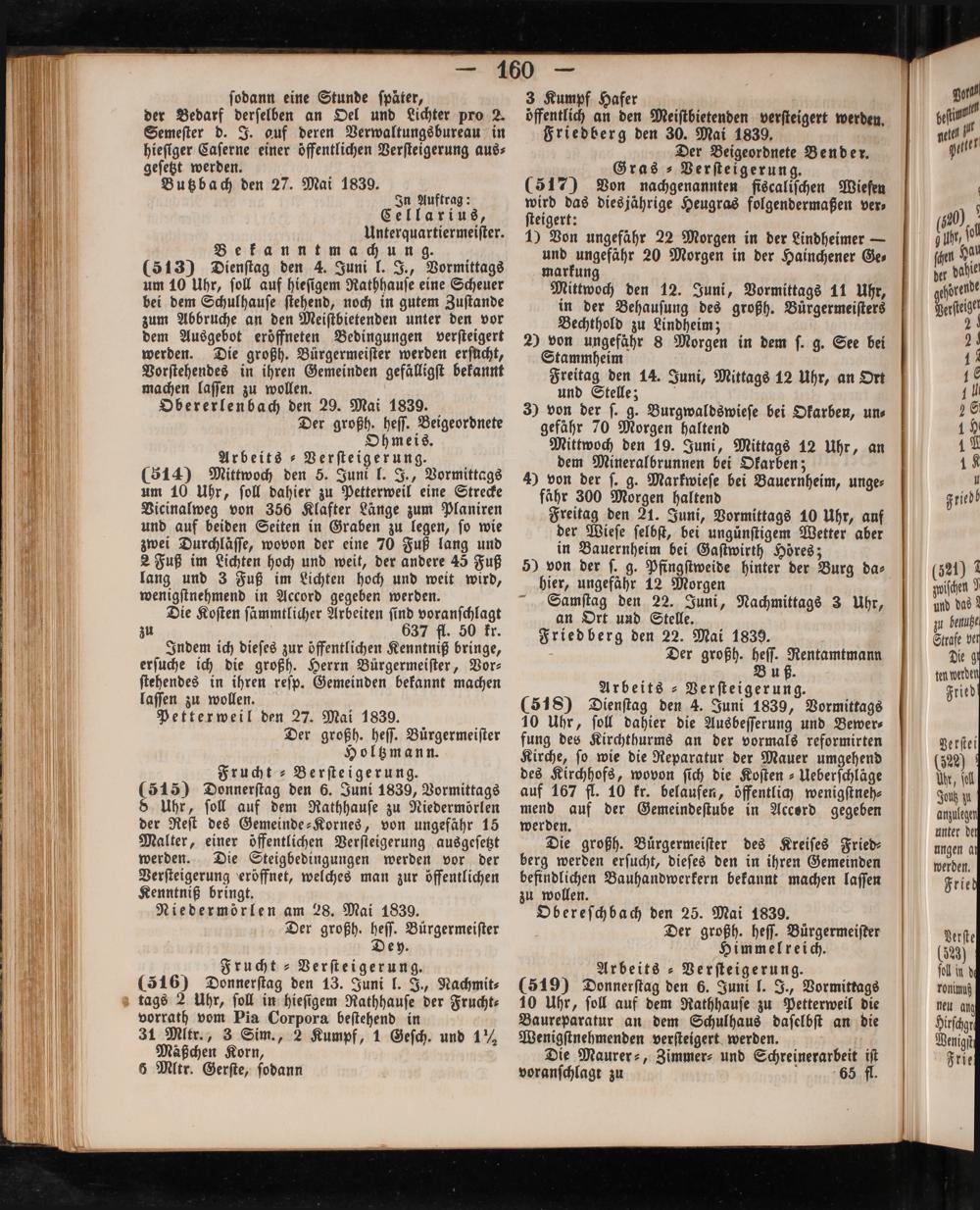 Cellarius, Unterquartiermeiſter. Bekanntmachung. (513) Dienſtag den 4. Juni l. J., Vormittags um 10 Uhr, ſoll auf hieſigem Rathhauſe eine Scheuer bei dem Schulhauſe ſtehend, noch in gutem Zuſtande zum Abbruche an den Meiſtbietenden unter den vor dem Ausgebot eröffneten Bedingungen verſteigert werden. Die großh. Buͤrgermeiſter werden erſucht, Vorſtehendes in ihren Gemeinden gefälligſt bekannt machen laſſen zu wollen. Obererlenbach den 29. Mai 1839. Der großh. heſſ. Beigeordnete Ohmeis. Arbeits-Verſteigerung. (514) Mittwoch den 5. Juni l. J., Vormittags um 10 Uhr, ſoll dahier zu Petterweil eine Strecke Vicinalweg von 356 Klafter Länge zum Planiren und auf beiden Seiten in Graben zu legen, ſo wie zwei Durchläſſe, wovon der eine 70 Fuß lang und 2 Fuß im Lichten hoch und weit, der andere 45 Fuß lang und 3 Fuß im Lichten hoch und weit wird, wenigſtnehmend in Accord gegeben werden. Die Koſten ſämmtlicher Arbeiten ſind voranſchlagt zu 637 fl. 50 kr. Indem ich dieſes zur öffentlichen Kenntniß bringe, erſuche ich die großh. Herrn Bürgermeiſter, Vor⸗ ſtehendes in ihren reſp. Gemeinden bekannt machen laſſen zu wollen. Petterweil den J. Mai 1839. Der großh. heſſ. Buͤrgermeiſter ö Holtzmann. Frucht ⸗Berſteigerung. ne Donnerſtag den 6. Juni 1839, Vormittags Uhr, ſoll auf dem Rathhauſe zu Niedermörlen der Reſt des Gemeinde-Kornes, von ungefähr 15 Malter, einer öffentlichen Verſteigerung ausgeſetzt werden. Die Steigbedingungen werden vor der Verſteigerung eröffnet, welches man zur öffentlichen Kenntniß bringt. Niedermörlen am 28. Mai 1839. Der großh. heſſ. Bürgermeiſter Dey. Frucht ⸗Verſteigerung. (516) Donnerſtag den 13. Juni l. J., Nachmit⸗ tags 2 Uhr, ſoll in hieſigem Rathhauſe der Frucht⸗ vorrath vom Pia Corpora beſtehend in 31 Mltr., 3 Sim., 2 Kumpf, 1 Geſch. und 1½ Maͤßchen Korn, 6 Mltr. Gerſte, ſodann