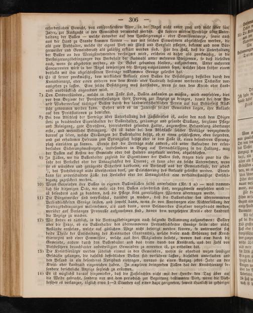 erforderlichen Gewicht, von entſprechendem Alter, in der Regel nicht unter zwei und nicht über fünf Jahre, zur Nachzucht in den Gemeinden verwendet werden. Es können mithin Verträge über Unter⸗ haltung der Bullen— welche entweder auf dem Verſteigerungs⸗ oder Somiſſionswege, ſowie auch aus der Hand zu Stande kommen können— nur mit ſolchen Einwohnern abgeſchloſſen werden, die als gute Viehhalter, welche ihr eignes Vieh mit Fleiß und Sorgfalt pflegen, bekannt und vom Bür⸗ germeiſter und Gemeinderath als zuläſſig erklärt worden ſind. Für den Fall, daß die Unterhaltung der Bullen an den Wenigſtnehmenden verſteigert wird, erſcheint es daher als zweckmäßig, in die Verſteigerungsbedingungen den Vorbehalt der Auswahl unter mehreren Steigerern, ſo daß dieſelben auch, wenn ſie abgeboten werden, an ihr Gebot gebunden bleiben, aufzunehmen. Unter mehreren Concurrenten wird in der Regel demjenigen der Vorzug einzuräumen ſeyn, welcher ſchon früher einem desfalls mit ihm abgeſchloſſenen Vertrage vollkommen Genüge geleiſtet hat.