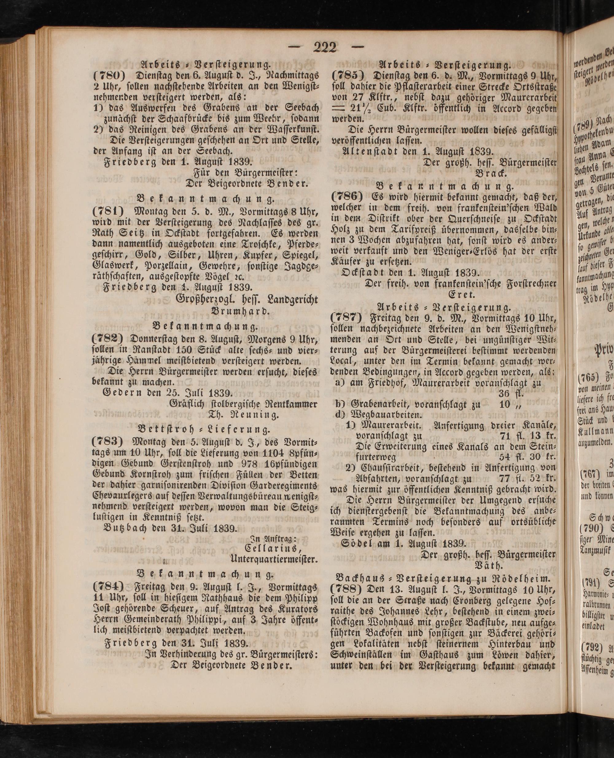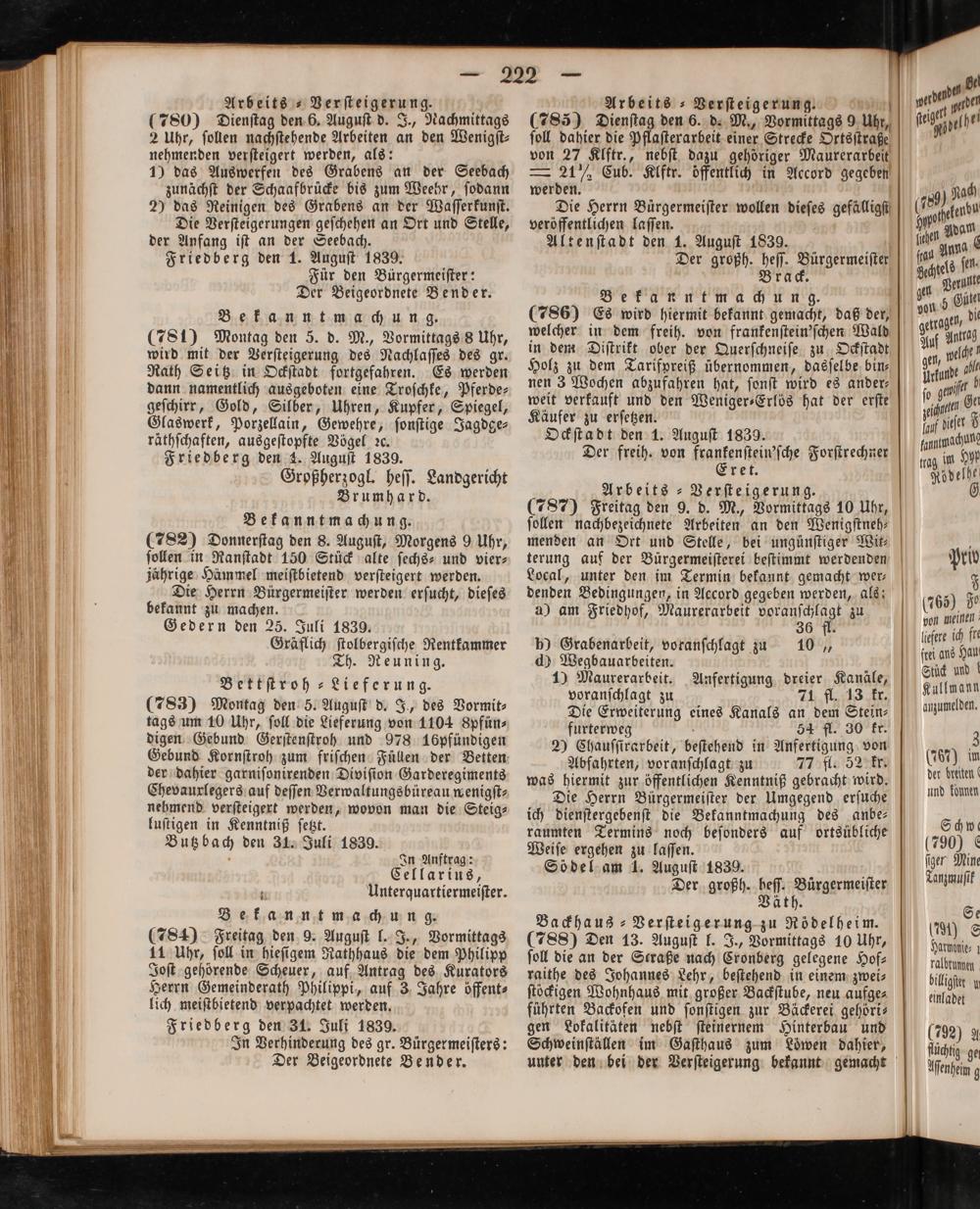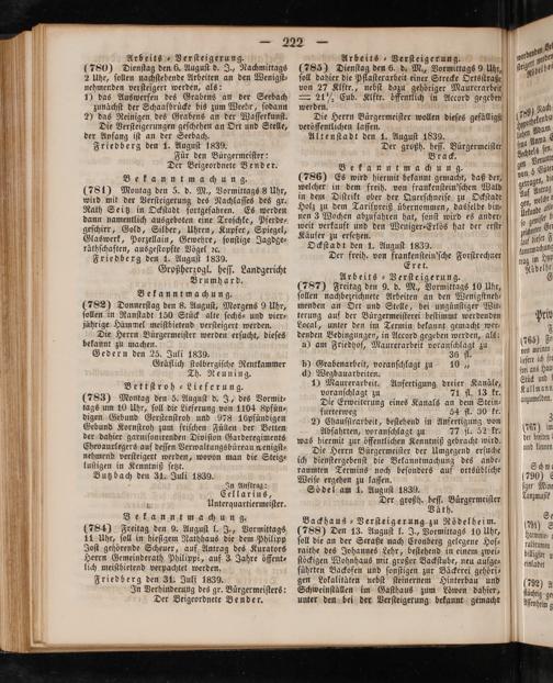 Arbeits-Verſteigerung. (780) Dienſtag den 6. Auguſt d. J., Nachmittags 2 Uhr, ſollen nachſtehende Arbeiten an den Wenigſt⸗ nehmenden verſteigert werden, als: 1) das Auswerfen des Grabens an der Seebach zunächſt der Schaafbrücke bis zum Weehr, ſodann 2) das Reinigen des Grabens an der Waſſerkunſt. Die Verſteigerungen geſchehen an Ort und Stelle, der Anfang iſt an der Seebach. Friedberg den 1. Auguſt 1839. Für den Bürgermeiſter: Der Beigeordnete Bender.