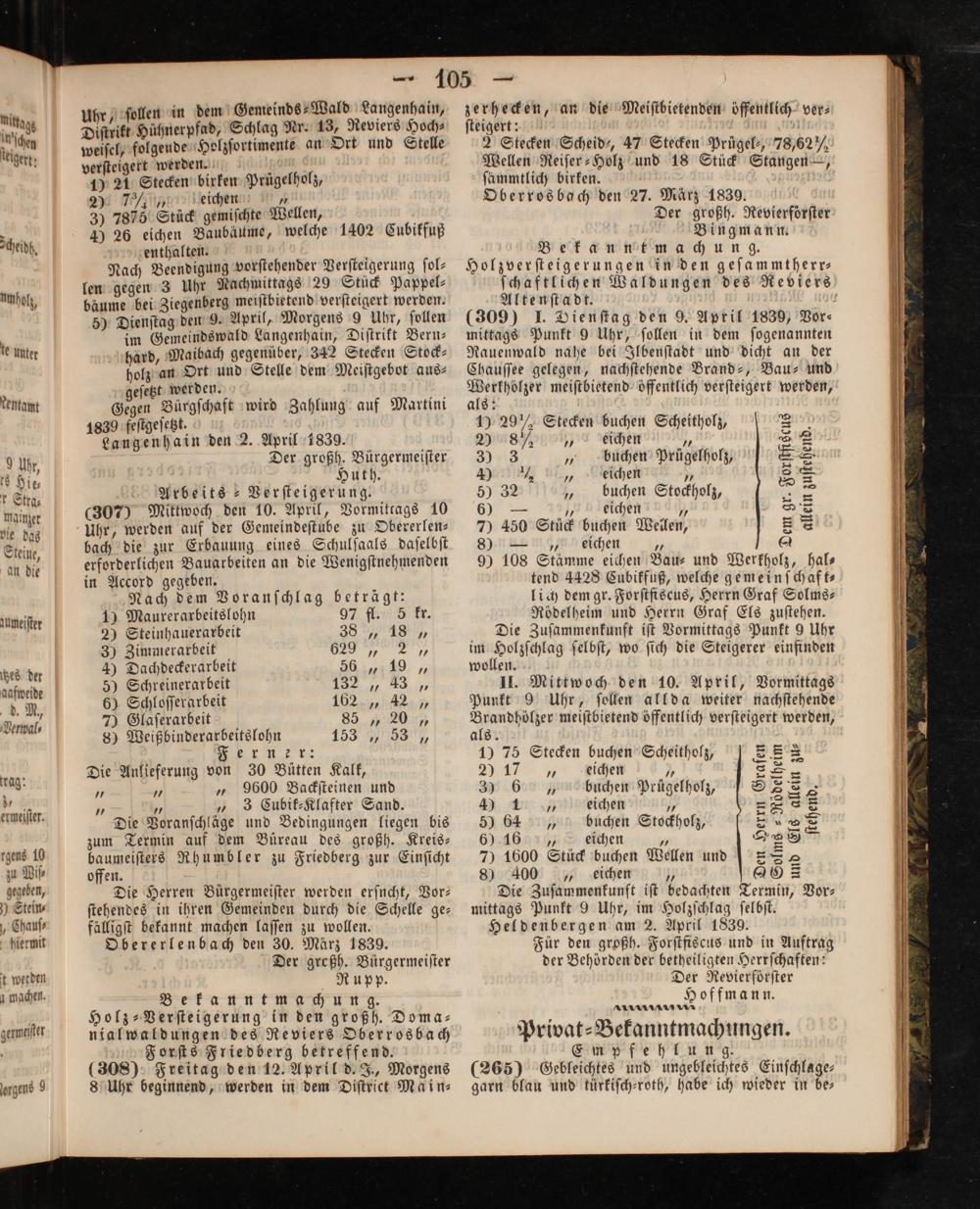 Uhr, ſollen in dem Gemeinds⸗Wald Langenhain, Diſtritt Hühnerpfad, Schlag Nr. 13, Reviers Hoch⸗ weiſel, folgende Holzſortimente an Ort und Stelle verſteigert werden. 1 1 21 5 85 1 Prügelholz, 2) 7½ᷣ„, eichen 1 3) 7876 Stück gemiſchte Wellen, J 26 eichen Baubäume, welche 1402 Cubikfuß enthalten. N Nach Beendigung vorſtehender Verſteigerung ſol⸗ len gegen 3 Uhr Nachmittags 29 Stück Pappel⸗ bäume bei Ziegenberg meiſtbietend verſteigert werden. 5) Dienſtag den 9. April, Morgens 9 Uhr, ſollen im Gemeindswald Langenhain, Diſtrikt Bern— hard, Maibach gegenüber, 342 Stecken Stock- holz an Ort und Stelle dem Meiſtgebot aus— geſetzt werden.. An Gegen Bürgſchaft wird Zahlung auf Martini 1839 feſtgeſetzt. N Langenhain den 2. April 1839. Der großh. Bürgermeiſter Huth. Arbeits ⸗Verſteigerung. (307) Mittwoch den 10. April, Vormittags 10 Uhr, werden auf der Gemeindeſtube zu Obererlen— bach die zur Erbauung eines Schulſaals daſelbſt erforderlichen Bauarbeiten an die Wenigſtnehmenden in Accord gegeben. Nach dem Voranſchlag beträgt: