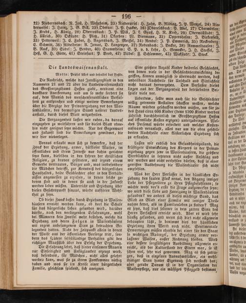 Die Nachricht, welche das Intelligenzblatt in den Nummern 21 und 22 über die Landeswaiſenanſtalt des Großherzogthums Heſſen giebt, verdient eine dankbare Anerkennung und um ſo mehr fordert ſie auf, dem Wunſch des menſchenfreundlichen Verfaſ— ſers zu entſprechen und einige weitere Bemerkungen über die Vorzüge der Privaterziehung vor den Wai— ſenhäuſern, den dermaligen Stand uaſerer Landes— anſtalt, durch dieſes Blatt mitzutheilen.