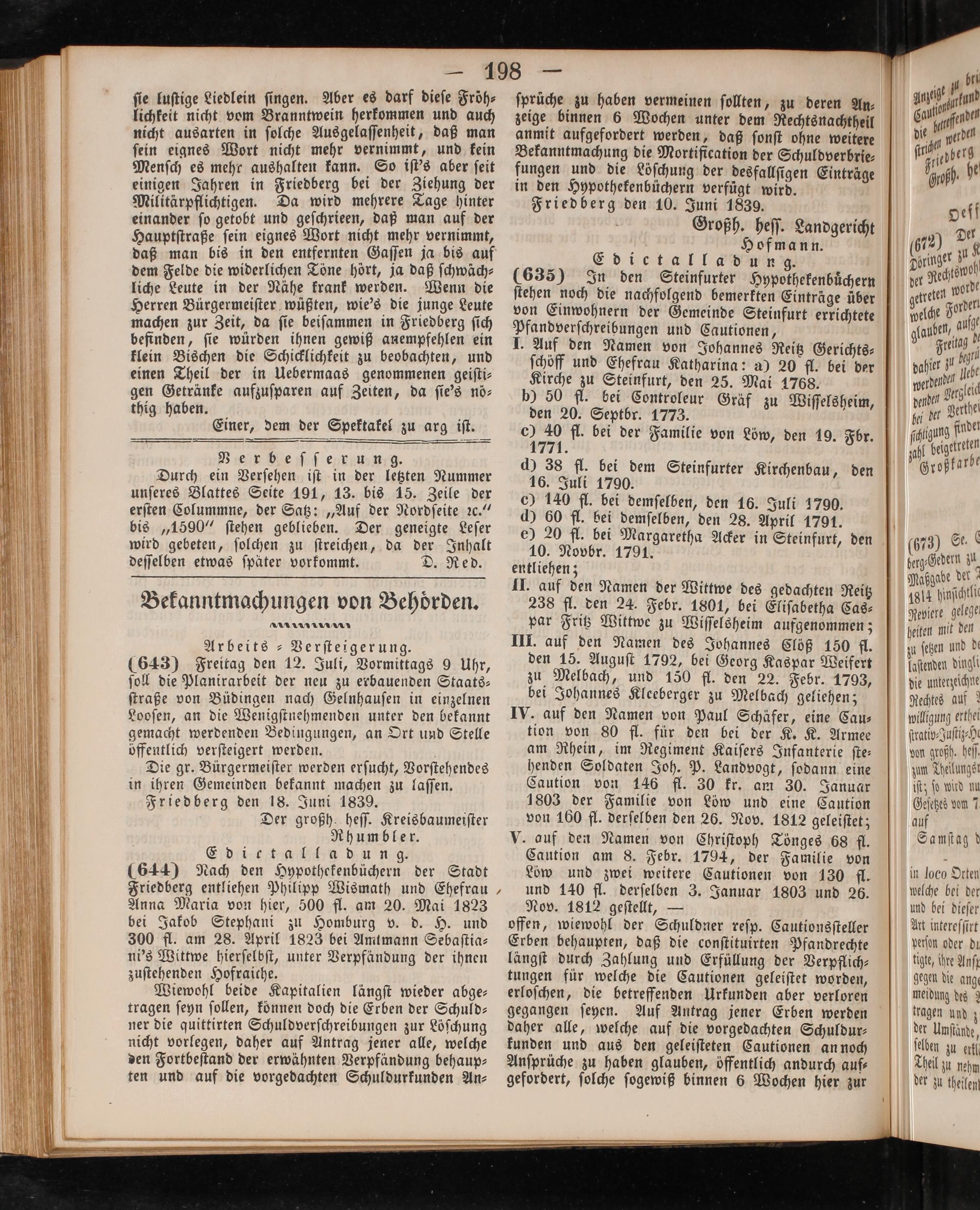 (644) Nach den Hypothekenbüchern der Stadt Friedberg entliehen Philipp Wismath und Ehefrau Anna Maria von hier, 500 fl. am 20. Mai 1823 bei Jakob Stephani zu Homburg v. d. H. und 300 fl. am 28. April 1823 bei Amtmann Sebaſtia⸗ ni's Wittwe hierſelbſt, unter Verpfändung der ihnen zuſtehenden Hofraithe.