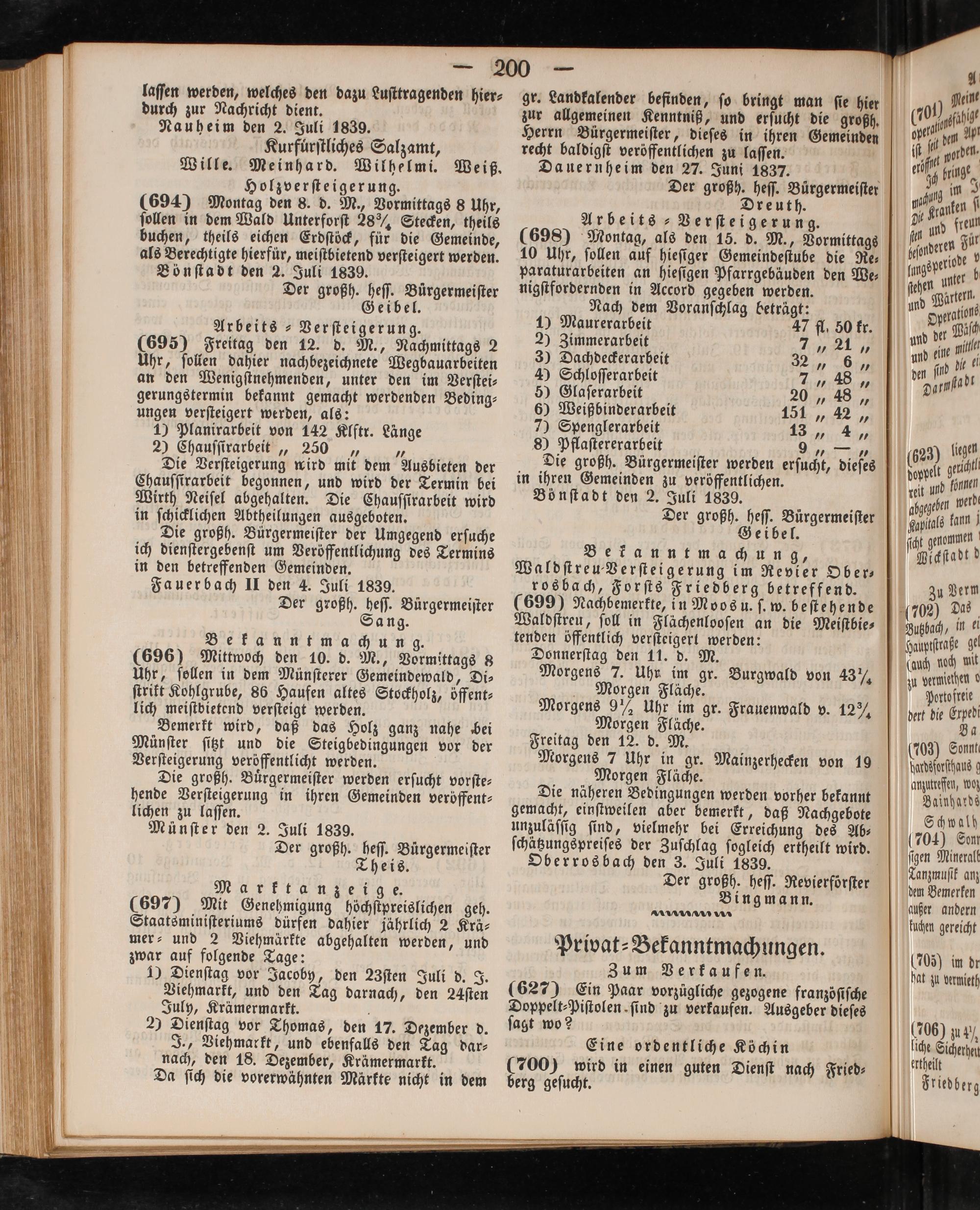 zur allgemeinen Kenntniß, und erſucht die großh. Herrn Bürgermeiſter, dieſes in ihren Gemeinden recht baldigſt veröffentlichen zu laſſen. Dauernheim den 27. Juni 1837. g Der großh. heſſ. Bürgermeiſter Dreuth. Arbeits⸗Verſteigerung. (698) Montag, als den 15. d. M., Vormittags 10 Uhr, ſollen auf hieſiger Gemeindeſtube die Re⸗ paraturarbeiten an hieſigen Pfarrgebäuden den We⸗ nigſtfordernden in Accord gegeben werden. Nach dem Voranſchlag beträgt: