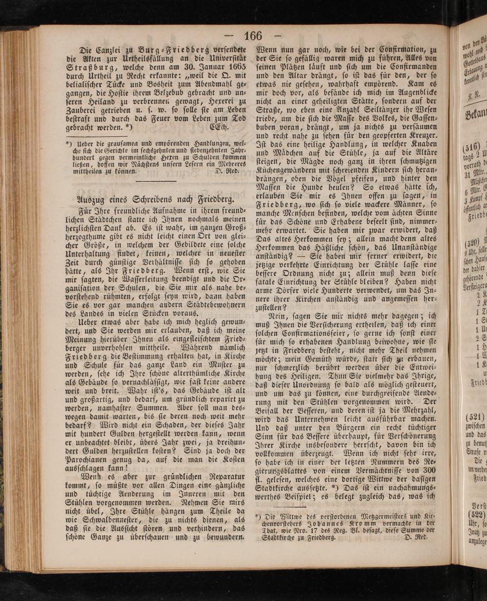 Ueber etwas aber habe ich mich heglich gewun— dert, und Sie werden mir erlauben, daß ich meine Meinung hierüber Ihnen als eingefleiſchtem Fried— berger unverhohlen mittheile. Während nämlich Friedberg die Beſtimmung erhalten hat, in Kirche und Schule für das ganze Land ein Muſter zu werden, ſehe ich Ihre ſchöne alterthümliche Kirche als Gebäude ſo vernachläſſigt, wie faſt keine andere weit und breit. Wahr iſt's, das Gebäude iſt alt und großartig, und bedarf, um gründlich reparirt zu werden, namhafter Summen. Aber ſoll man des— wegen damit warten, bis ſie deren noch weit mehr bedarf? Wird nicht ein Schaden, der dieſes Jahr mit hundert Gulden hergeſtellt werden kann, wenn er unbeachtet bleibt, übers Jahr zwei, ja dreihun⸗ dert Gulden herzuſtellen koſten? Sind ja doch der Parochianen genug da, auf die man die Koſten ausſchlagen kann!