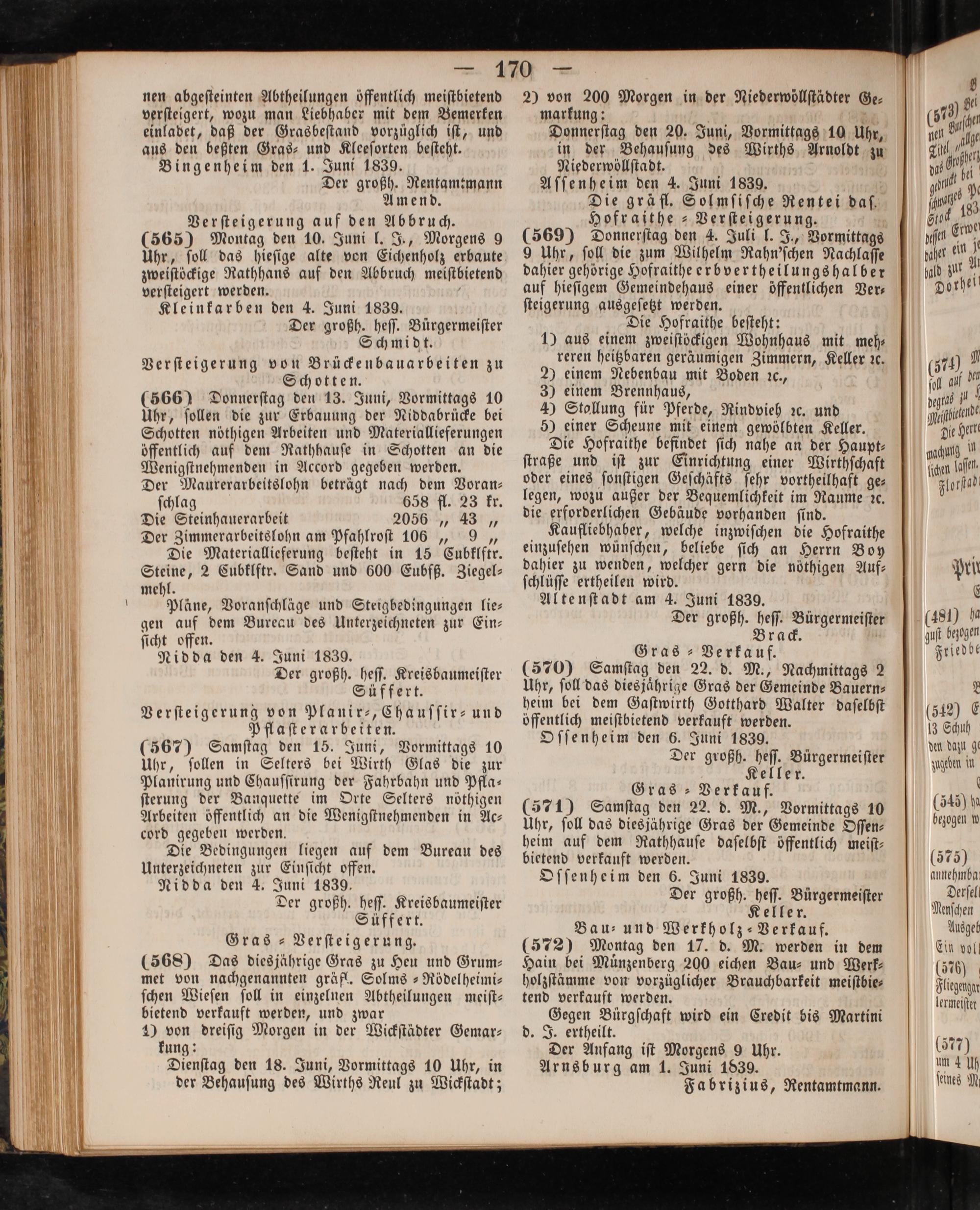 Der großh. heſſ. Bürgermeiſter Brack. l Gras- Verkauf. (570) Samſtag den 22. d. M., Nachmittags 2 Uhr, ſoll das diesjaͤhrige Gras der Gemeinde Bauern— heim bei dem Gaſtwirth Gotthard Walter daſelbſt öffentlich meiſtbietend verkauft werden. Oſſenheim den 6. Juni 1839. Der großh. heſſ. Bürgermeiſter Keller. Gras- Verkauf. (571) Samſtag den 22. d. M., Vormittags 10 Uhr, ſoll das diesjährige Gras der Gemeinde Oſſen— heim auf dem Rathhauſe daſelbſt öffentlich meiſt— bietend verkauft werden. Oſſenheim den 6. Juni 1839. Der großh. heſſ. Buͤrgermeiſter Keller. Bau- und Werkholz⸗Verkauf. (572) Montag den 17. d. M. werden in dem Hain bei Muͤnzenberg 200 eichen Bau- und Werk⸗ holzſtämme von vorzüglicher Brauchbarkeit meiſtbie— tend verkauft werden.