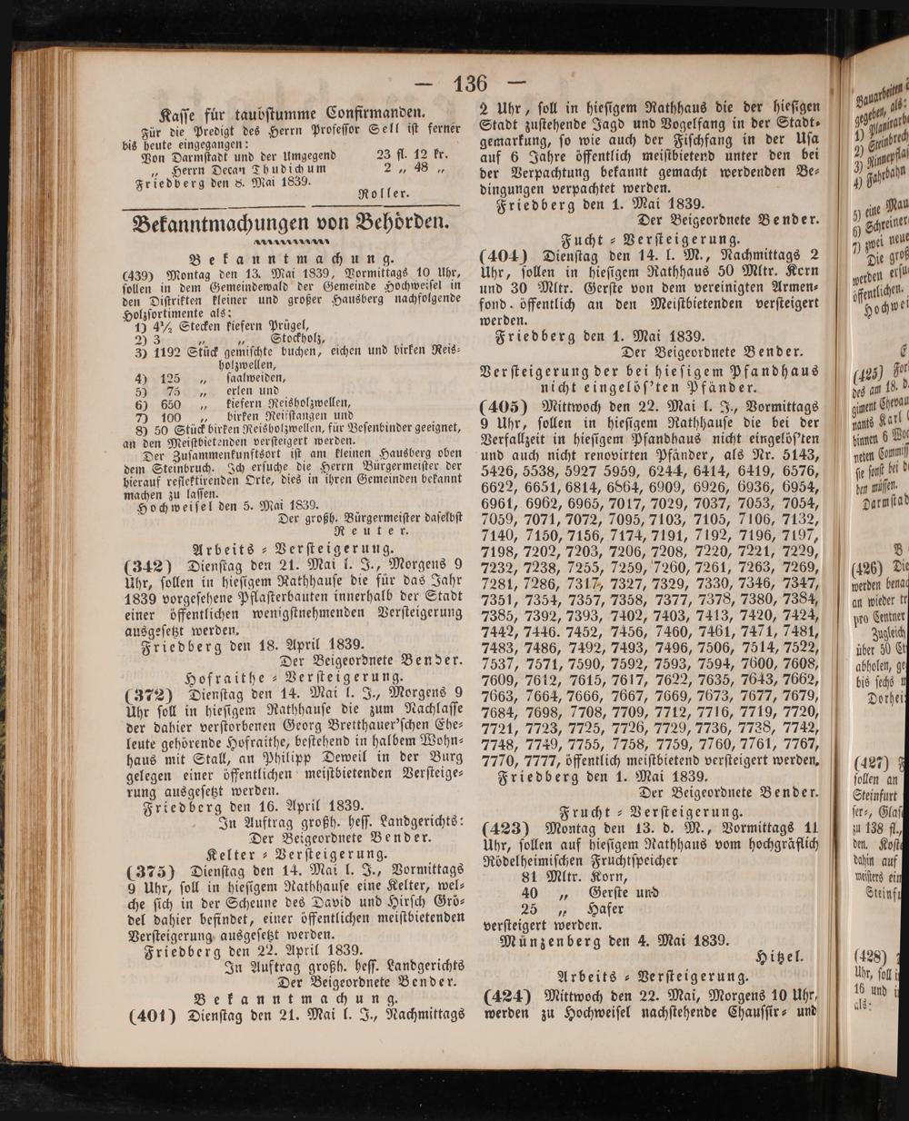 gemarkung, ſo wie auch der Fiſchfang in der Uſa auf 6 Jahre öffentlich meiſtbietend unter den bei der Verpachtung bekannt gemacht werdenden Be— dingungen verpachtet werden. Friedberg den 1. Mai 1839. Der Beigeordnete Bender. Fucht⸗Verſteigerung. (404) Dienſtag den 14. l. M., Nachmittags 2 Uhr, ſollen in hieſigem Rathhaus 50 Mltr. Kern und 30 Mltr. Gerſte von dem vereinigten Armen— fond öffentlich an den Meiſtbietenden verſteigert werden. Friedberg den 1. Mai 1839. Der Beigeordnete Bender. Verſteigerung der bei hieſigem Pfandhaus nicht eingelöſ'ten Pfänder.