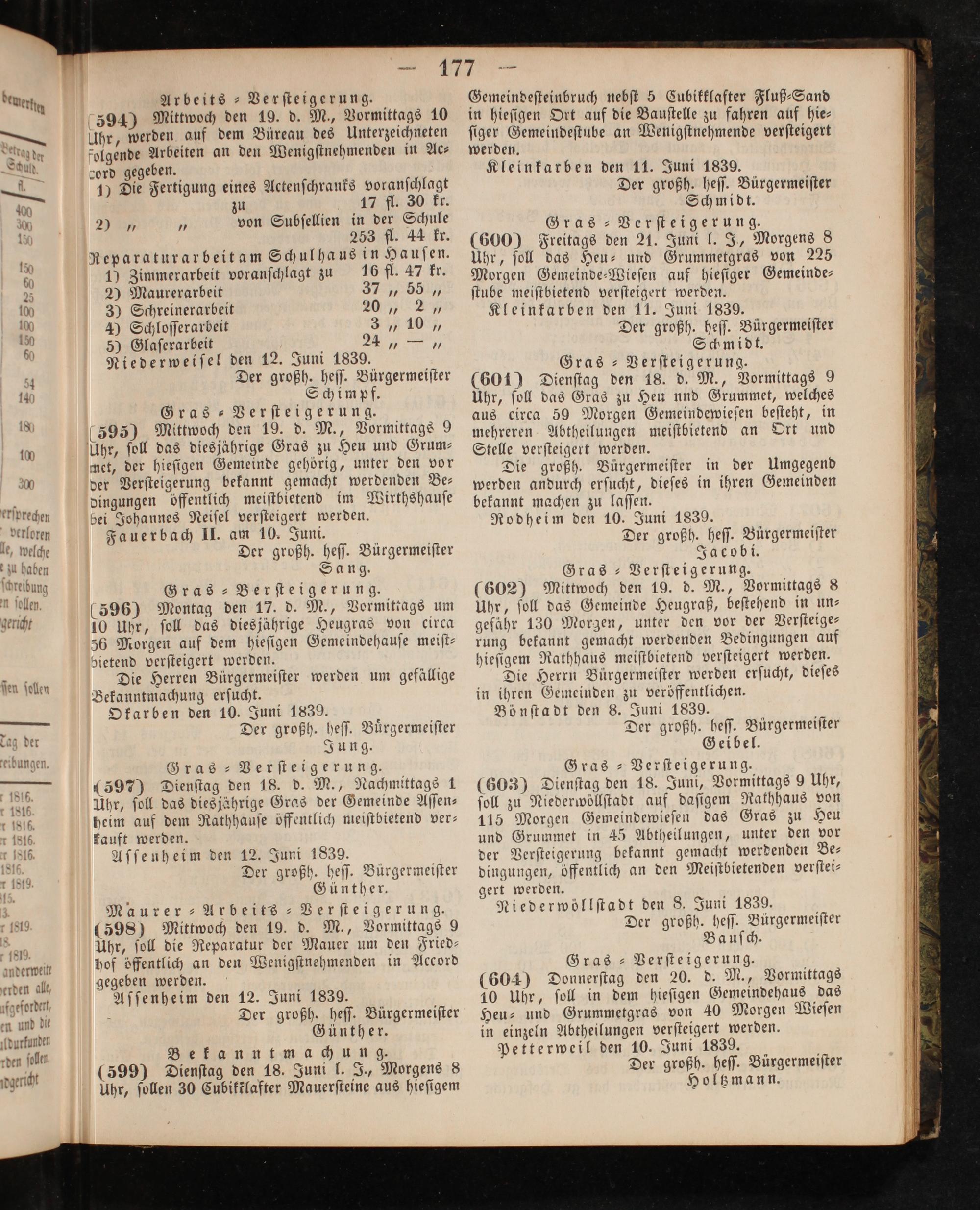 Bönſtadt den 8. Juni 1839. Der großh. heſſ. Bürgermeiſter Geibel. Gras-Verſteigerung. (603) Dienſtag den 18. Juni, Vormittags 9 Uhr, ſoll zu Niederwöllſtadt auf daſigem Rathhaus von 115 Morgen Gemeindewieſen das Gras zu Heu und Grummet in 45 Abtheilungen, unter den vor der Verſteigerung bekannt gemacht werdenden Be⸗ dingungen, öffentlich an den Meiſtbietenden verſtei⸗ gert werden. Niederwöllſtadt den 8. Juni 1839. Der großh. heſſ. Bürgermeiſter Bauſch. Gras-Verſteigerung. (604) Donnerſtag den 20. d. M., Vormittags 10 Uhr, ſoll in dem hieſigen Gemeindehaus das Heu- und Grummetgras von 40 Morgen Wieſen in einzeln Abtheilungen verſteigert werden. petterweil den 10. Juni 1839. Der großh. heſſ. Bürgermeiſter Holtzmann.