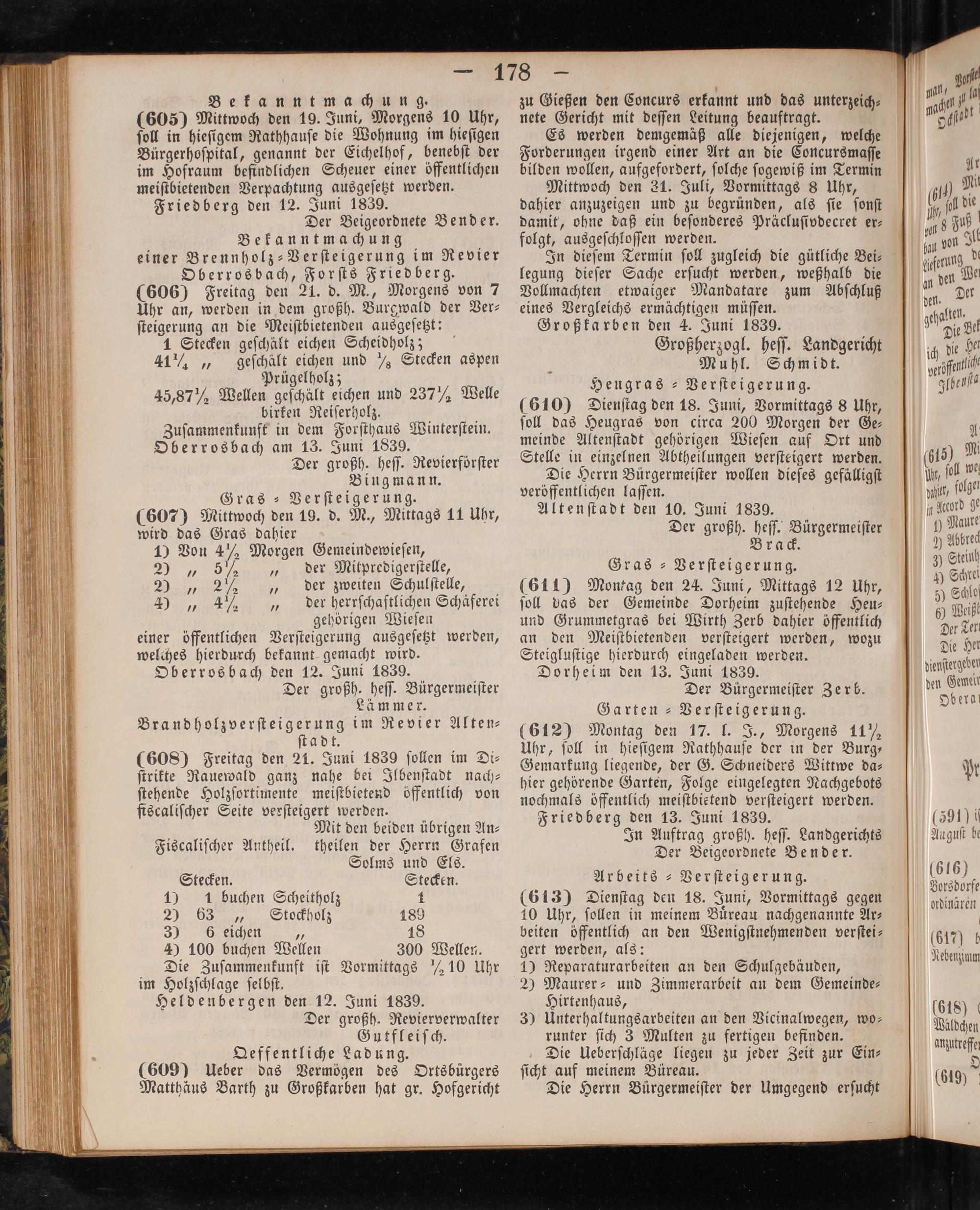 Großkarben den 4. Juni 1839. Großherzogl. heſſ. Landgericht Muhl. Schmidt. Heugras-Verſteigerung. (610) Dienſtag den 18. Juni, Vormittags 8 Uhr, ſoll das Heugras von circa 200 Morgen der Ge— meinde Altenſtadt gehörigen Wieſen auf Ort und Stelle in einzelnen Abtheilungen verſteigert werden. Die Herrn Bürgermeiſter wollen dieſes gefälligſt veröffentlichen laſſen. Altenſtadt den 10. Juni 1839. Der großh. heſſ. Bürgermeiſter Brack. Gras-Verſteigerung. (611) Montag den 24. Juni, Mittags 12 Uhr, ſoll das der Gemeinde Dorheim zuſtehende Heu— und Grummetgras bei Wirth Zerb dahier öffentlich an den Meiſtbietenden verſteigert werden, wozu Steigluſtige hierdurch eingeladen werden. Dorheim den 13. Juni 1839. Der Bürgermeiſter Zerb. Garten-Verſteigerung. (612) Montag den 17. l. J., Morgens 11½ Uhr, ſoll in hieſigem Rathhauſe der in der Burg— Gemarkung liegende, der G. Schneiders Wittwe da— hier gehörende Garten, Folge eingelegten Nachgebots nochmals öffentlich meiſtbietend verſteigert werden. Friedberg den 13. Juni 1839. In Auftrag großh. heſſ. Landgerichts Der Beigeordnete Bender.