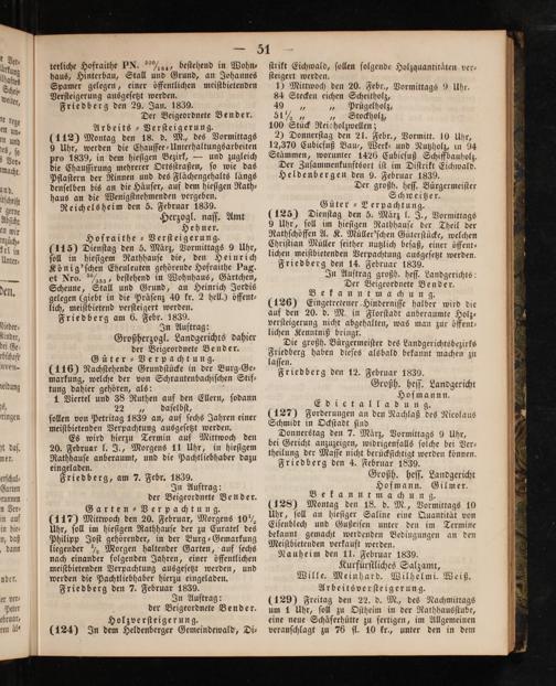 Arbeits-Verſteigerung. 5 (112) Montag den 18. d. M., des Vormittags 9 Uhr, werden die Chauſſee-Unterhaltungsarbeiten pro 1839, in dem hieſigen Bezirk,— und zugleich die Chauſſirung mehrerer Ortsſtraßen, ſo wie das Pflaſtern der Rinnen und des Flächengehalts längs denſelben bis an die Häuſer, auf dem hieſigen Rath⸗ haus an die Wenigſtnehmenden vergeben. Reichelsheim den 5. Februar 1839. Herzogl. naſſ. Amt Hehner. Hofraithe-Verſteigerung. (115) Dienſtag den 5. März, Vormittags 9 Uhr, ſoll in hieſigem Rathhauſe die, den Heinrich König'ſchen Eheuleuten gehörende Hofraithe Pag. et Nro. /s, beſtehend in Wohnhaus, Gärtchen, Scheune, Stall und Grund, an Heinrich Jordis gelegen(giebt in die Präſenz 40 kr. 2 hell.) öffent⸗ lich, meiſtbietend verſteigert werden. Friedberg am 6. Febr. 1839. In Auftrag: 8 Großherzogl. Landgerichts dahier der Beigeordnete Bender. Güter ⸗ Verpachtung. (116) Nachſtehende Grundſtücke in der Burg-Ge⸗ markung, welche der von Schrautenbachiſchen Stif— tung dahier gehören, als: 5 1 Viertel und 38 Ruthen auf den Ellern, ſodann 22 dDaſelbſt, ſollen von Petritag 1839 an, auf ſechs Jahren einer meiſtbietenden Verpachtung ausgeſetzt werden. Es wird hierzu Termin auf Mittwoch den 20. Februar l. J., Morgens 11 Uhr, in hieſigem Rathhauſe anberaumt, und die Pachtliebhaber dazu eingeladen. Friedberg, am 7. Febr. 1839. In Auftrag: der Beigeordnete Bender. Garten ⸗ Verpachtung. (117) Mittwoch den 20. Februar, Morgens 10 ½¼ Uhr, ſoll im hieſigen Rathhauſe der zu Curatel des Philipp Joſt gehörender, in der Burg-Gemarkung liegender/ Morgen haltender Garten, auf ſechs nach einander folgenden Jahren, einer öffentlichen meiſtbietenden Verpachtung ausgeſetzt werden, und werden die Pachtliebhaber hierzu eingeladen. Friedberg den 7. Februar 1839. In Auftrag: der Beigeordnete Bender. Holzverſteigerung. (124) In dem Heldenberger Gemeindewald, Di—