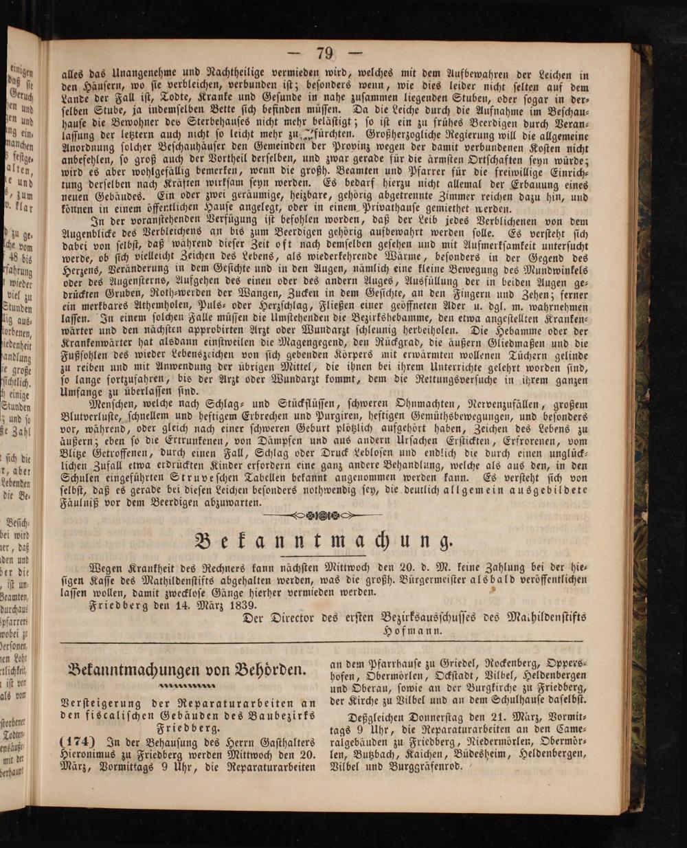In der voranſtehenden Verfügung iſt befohlen worden, daß der Leib jedes Verblichenen von dem Augenblicke des Verbleichens an bis zum Beerdigen gehörig aufbewahrt werden ſolle. Es verſteht ſich dabei von ſelbſt, daß während dieſer Zeit oft nach demſelben geſehen und mit Aufmerkſamkeit unterſucht werde, ob ſich vielleicht Zeichen des Lebens, als wiederkehrende Wärme, beſonders in der Gegend des Herzens, Veränderung in dem Geſichte und in den Augen, nämlich eine kleine Bewegung des Mundwinkels oder des Augenſterns, Aufgehen des einen oder des andern Auges, Ausfüllung der in beiden Augen ge⸗ drückten Gruben, Roth⸗werden der Wangen, Zucken in dem Geſichte, an den Fingern und Zehen; ferner ein merkbares Athemholen, Puls- oder Herzſchlag, Fließen einer geöffneten Ader u. dgl. m. wahrnehmen laſſen. In einem ſolchen Falle müſſen die Umſtehenden die Bezirkshebamme, den etwa angeſtellten Kranken— wärter und den nächſten approbirten Arzt oder Wundarzt ſchleunig herbeiholen. Die Hebamme oder der Krankenwärter hat alsdann einſtweilen die Magengegend, den Rückgrad, die äußern Gliedmaßen und die Fußſohlen des wieder Lebenszeichen von ſich gebenden Körpers mit erwärmten wollenen Tüchern gelinde zu reiben und mit Anwendung der übrigen Mittel, die ihnen bei ihrem Unterrichte gelehrt worden ſind, ſo lange fortzufahren, bis der Arzt oder Wundarzt kommt, dem die Rettungsverſuche in ihrem ganzen Umfange zu überlaſſen ſind.