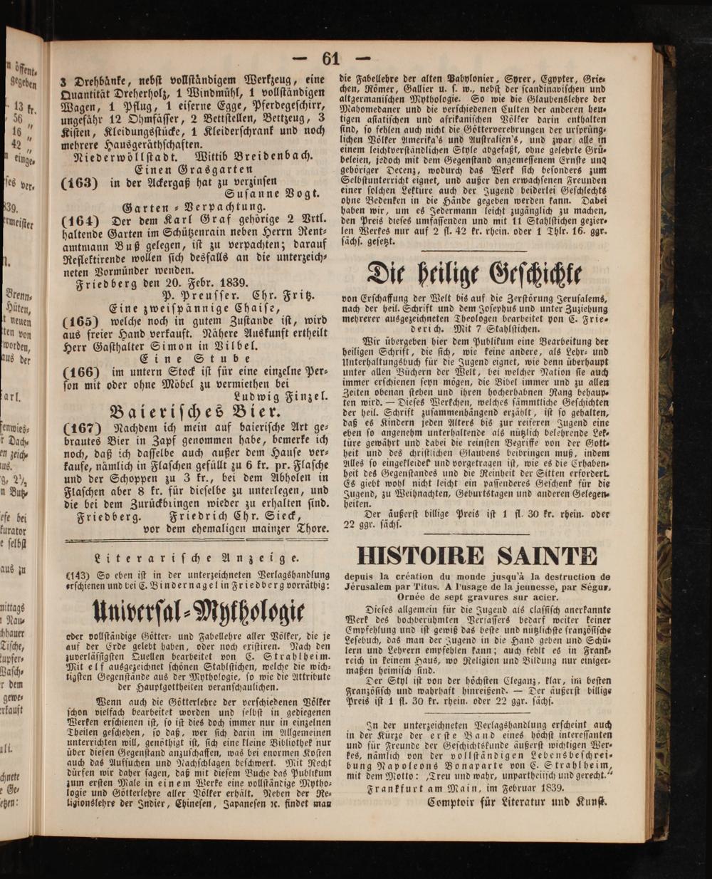 3 Drehbänke, nebſt vollſtändigem Werkzeug, eine Quantität Dreherholz, 1 Windmühl, 1 vollſtändigen Wagen, 1 Pflug, 1 eiſerne Egge, Pferdegeſchirr, ungefähr 12 Ohmfäſſer, 2 Bettſtellen, Bettzeug, 3 Kiſten, Kleidungsſtücke, 1 Kleiderſchrank und noch mehrere Hausgeräthſchaften. Niederwöllſtadt. Wittib Breidenbach. Einen Grasgarten, 6 63) in der Ackergaß hat zu verzinſen 2 0 1 5 Vogt. Garten ⸗ Verpachtung. (164) Der dem Karl Graf gehörige 2 Prtl. haltende Garten im Schützenrain neben Herrn Rent— amtmann Buß gelegen, iſt zu verpachten; darauf Reflektirende wollen ſich desfalls an die unterzeich— neten Vormünder wenden. Friedberg den 20. Febr. 1839. P. Preuſſer. Chr. Fritz. Eine zweiſpännige Chaiſe, a (165) welche noch in gutem Zuſtande iſt, wird aus freier Hand verkauft. Nähere Auskunft ertheilt Herr Gaſthalter Simon in Vilbel. rente (166) im untern Stock iſt für eine einzelne Per⸗ ſon mit oder ohne Moͤbel zu vermiethen bei Ludwig Finzel.