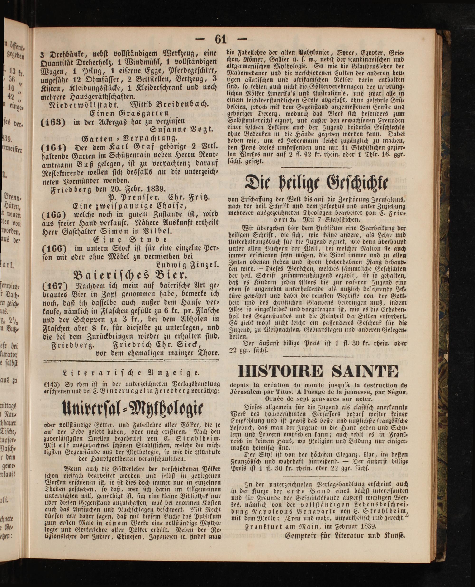 In der unterzeichneten Verlagshandlung erſcheint auch in der Kürze der erſte Band eines höchſt intereſſanten und für Freunde der Geſchichtskunde äußerſt wichtigen Wer⸗ kes, nämlich von der vollſtändigen Lebensbeſchrei⸗ bung Napoleons Bonaparte von C. Strahlheim, mit dem Motto:„Treu und wahr, unpartheiiſch und gerecht.“
