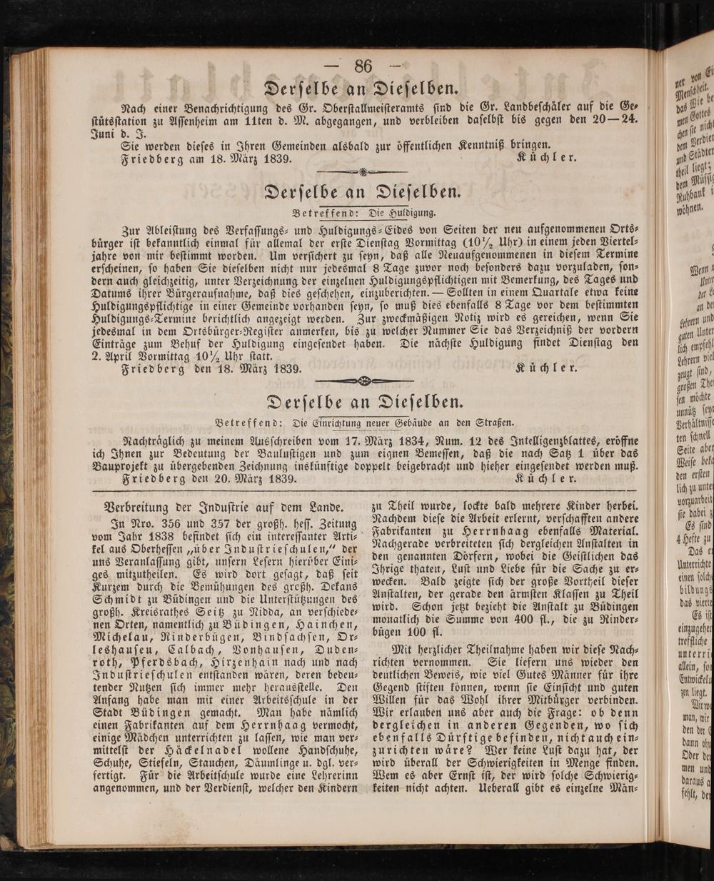Zur Ableiſtung des Verfaſſungs- und Huldigungs-Eides von Seiten der neu aufgenommenen Orts⸗ bürger iſt bekanntlich einmal für allemal der erſte Dienſtag Vormittag(10% Uhr) in einem jeden Viertel⸗ jahre von mir beſtimmt worden. Um verſichert zu ſeyn, daß alle Neuaufgenommenen in dieſem Termine erſcheinen, ſo haben Sie dieſelben nicht nur jedesmal 8 Tage zuvor noch beſonders dazu vorzuladen, ſon⸗ dern auch gleichzeitig, unter Verzeichnung der einzelnen Huldigungspflichtigen mit Bemerkung, des Tages und Datums ihrer Bürgeraufnahme, daß dies geſchehen, einzuberichten.— Sollten in einem Quartale etwa keine Huldigungspflichtige in einer Gemeinde vorhanden ſeyn, ſo muß dies ebenfalls 8 Tage vor dem beſtimmten Huldigungs-Termine berichtlich angezeigt werden. Zur zweckmäßigen Notiz wird es gereichen, wenn Sie jedesmal in dem Ortsbürger-Regiſter anmerken, bis zu welcher Nummer Sie das Verzeichniß der vordern