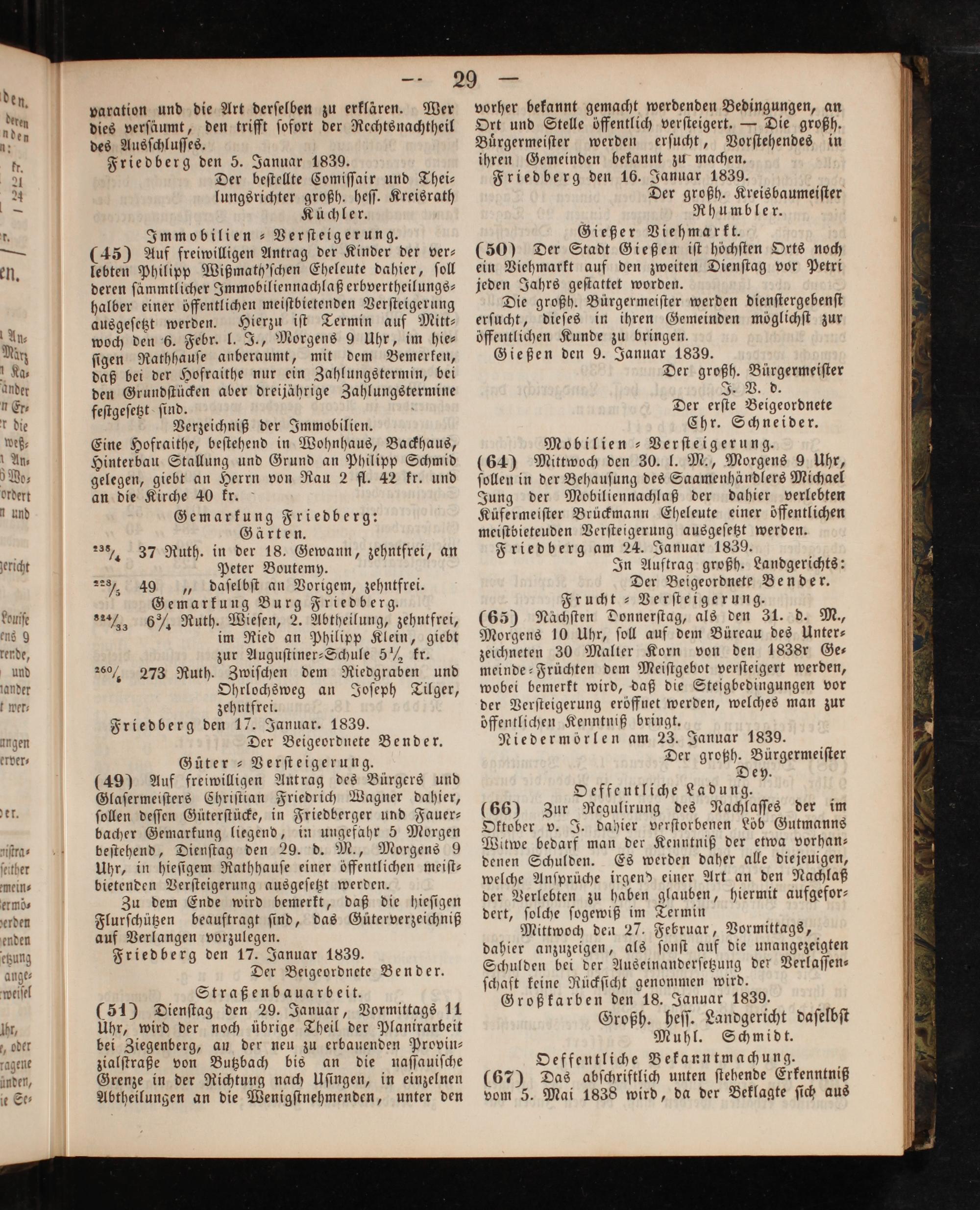 Gießen den 9. Januar 1839. Der großh. Buͤrgermeiſter V. d. Der erſte Beigeordnete Chr. Schneider. Mobilien-Verſteigerung. (64) Mittwoch den 30. l. M., Morgens 9 Uhr, ſollen in der Behauſung des Saamenhändlers Michael Jung der Mobiliennachlaß der dahier verlebten Küfermeiſter Brückmann Eheleute einer öffentlichen meiſtbieteuden Verſteigerung ausgeſetzt werden.
