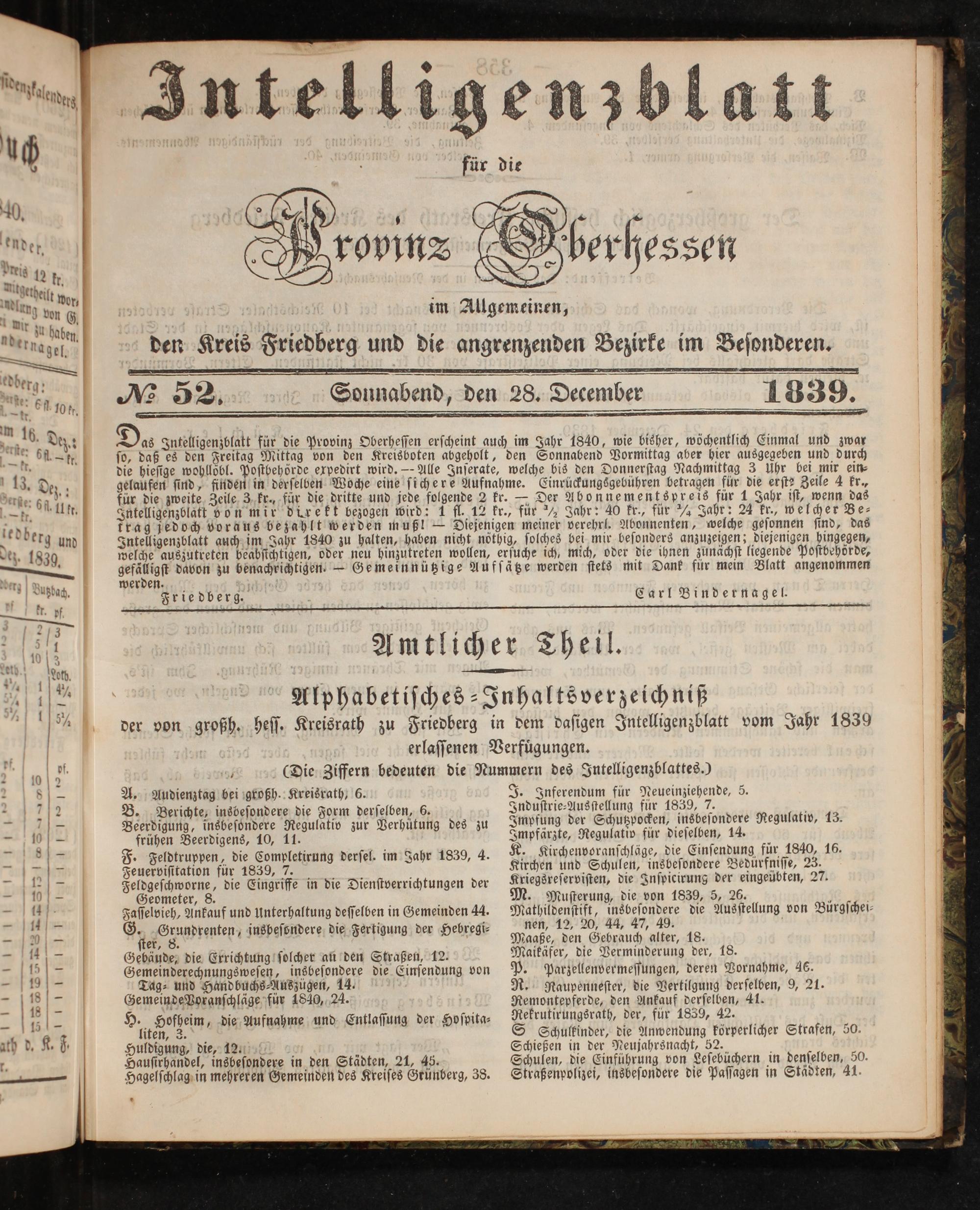 Alphabetiſches-Inhaltsverzeichniß der von großh. heſſ. Kreisrath zu Friedberg in dem daſigen Intelligenzblatt vom Jahr 1839 erlaſſenen Verfuͤgungen. J(Die Ziffern bedeuten die Nummern des Intelligenzblattes.)