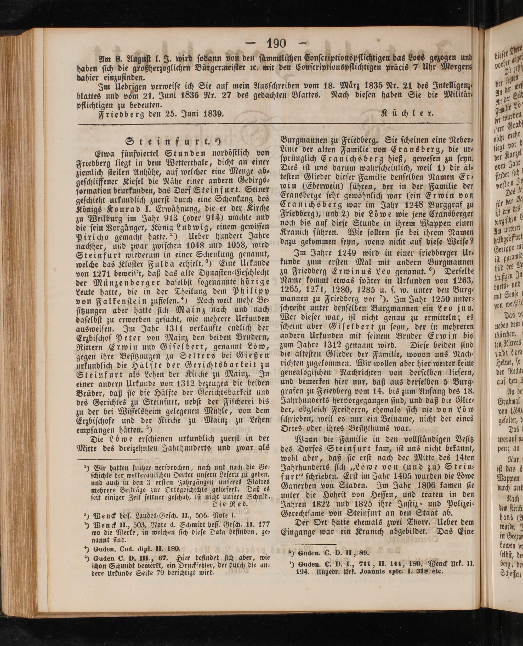Etwa fünfviertel Stunden nordöſtlich von Friedberg liegt in dem Wetterthale, dicht an einer ziemlich ſteilen Anhöhe, auf welcher eine Menge ab⸗ geſchliffener Kieſel die Nähe einer andern Gebirgs⸗ formation beurkunden, das Dorf Steinfurt. Seiner geſchieht urkundlich zuerſt durch eine Schenkung des Königs Konrad I. Erwähnung, die er der Kirche zu Weilburg im Jahr 913(oder 914) machte und die ſein Vorgänger, König Ludwig, einem gewiſſen Piricho gemacht hatte.) Ueber hundert Jahre nachher, und zwar zwiſchen 1048 und 1058, wird Steinfurt wiederum in einer Schenkung genannt, welche das Kloſter Fulda erhielt.“) Eine Urkunde von 1271 beweiſ't, daß das alte Dynaſten-Geſchlecht der Münzenberger daſelbſt ſogenannte hörige Leute hatte, die in der Theilung dem Philipp von Falkenſtein zuſtelen.“) Noch weit mehr Be⸗ ſitzungen aber hatte ſich Mainz nach und nach daſelbſt zu erwerben geſucht, wie mehrere Urkunden ausweiſen. Im Jahr 1311 verkaufte endlich der Erzbiſchof Peter von Mainz den beiden Brüdern, Rittern Erwin und Giſelbert, genannt Löw, gegen ihre Beſitzuugen zu Selters bei Gießen urkundlich die Hälfte der Gerichtsbarkeit zu Steinfurt als Lehen der Kirche zu Mainz. In einer andern Urkunde von 1312 bezeugen die beiden Brüder, daß ſie die Hälfte der Gerichtsbarkeit und des Gerichtes zu Steinfurt, nebſt der Fiſcherei bis zu der bei Wiſſelsheim gelegenen Mühle, von dem Erzbiſchofe und der Kirche zu Mainz zu Lehen empfangen hätten.)
