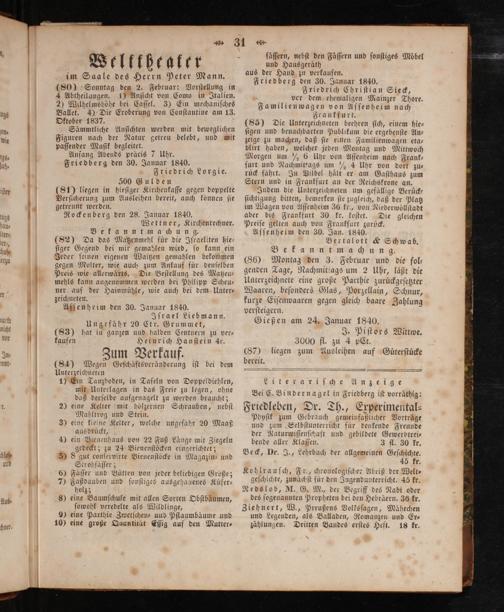 im Saale des Herrn Peter Mann. (80) Sonntag den 2. Februar: Vorſtellung in 4 Abtheilungen. 1) Anſicht von Como in Italien. 2) Wilhelmshöhe bei Caſſel. 3) Ein mechaniſches Ballet. 4) Die Eroberung von Conſtantine am 13. Oktober 1837.