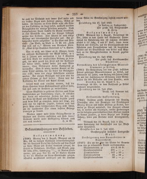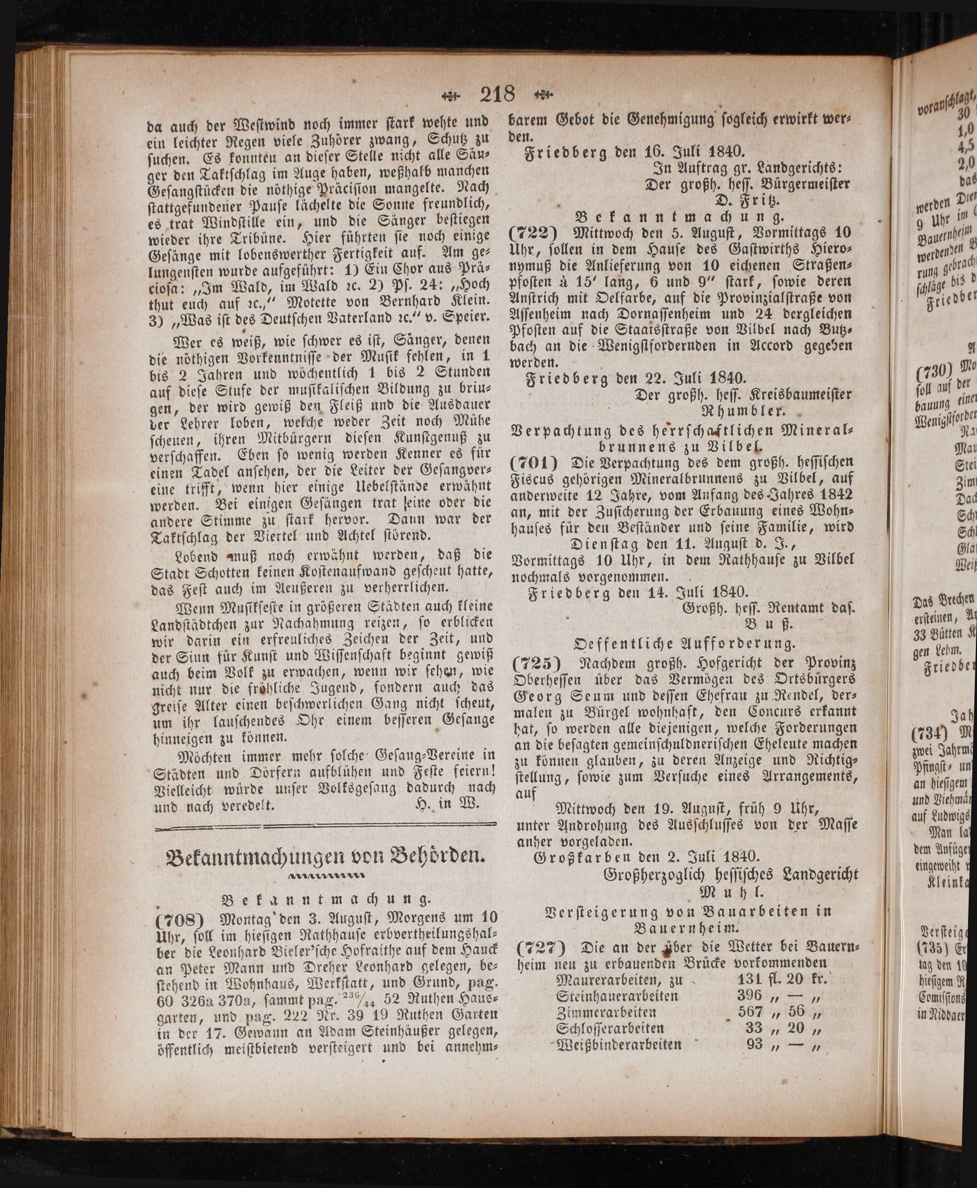 barem Gebot die Genehmigung ſogleich erwirkt wer⸗ den. Friedberg den 16. Juli 1840. In Auftrag gr. Landgerichts: Der großh. heſſ. Bürgermeiſter D. Fritz. 5 Bekanntmachung. (722) Mittwoch den 5. Auguſt, Vormittags 10 Uhr, ſollen in dem Hauſe des Gaſtwirths Hiero— nymuß die Anlieferung von 10 eichenen Straßen⸗ pfoſten à 15“ lang, 6 und 9“ ſtark, ſowie deren Anſtrich mit Oelfarbe, auf die Provinzialſtraße von Aſſenheim nach Dornaſſenheim und 24 dergleichen Pfoſten auf die Staatsſtraße von Vilbel nach Butz⸗ bach an die Wenigſlfordernden in Accord gegeben werden. 5 Friedberg den 22. Juli 1840. 5 Der großh. heſſ. Kreisbaumeiſter Rh umbler. Verpachtung des herrſchaftlichen Mineral- brunnens zu Vilbel. (701) Die Verpachtung des dem großh. heſſiſchen Fiscus gehörigen Mineralbrunnens zu Vilbel, auf anderweite 12 Jahre, vom Anfang des Jahres 1842 an, mit der Zuſicherung der Erbauung eines Wohn— hauſes für den Beſtänder und ſeine Familie, wird Dienſtag den 11. Auguſt d. J., Vormittags 10 Uhr, in dem Rathhauſe zu Vilbel nochmals vorgenommen. Friedberg den 14. Juli 1840. 5 Großh. heſſ. Rentamt daſ. Bun ß, Oeffentliche Aufforderung. (725) Nachdem großh. Hofgericht der Provinz Oberheſſen über das Vermögen des Ortsbürgers Georg Seum und deſſen Ehefrau zu Rendel, der— malen zu Bürgel wohnhaft, den Concurs erkannt hat, ſo werden alle diejenigen, welche Forderungen an die beſagten gemeinſchuldneriſchen Eheleute machen zu können glauben, zu deren Anzeige und Richtig⸗ 5 ſowie zum Verſuche eines Arrangements, au Mittwoch den 19. Auguſt, früh 9 Uhr, unter Androhung des Ausſchluſſes von der Maſſe anher vorgeladen. Großkarben den 2. Juli 1840. Großherzoglich heſſiſches Landgericht Muhl. a