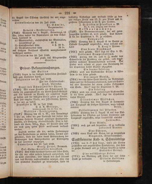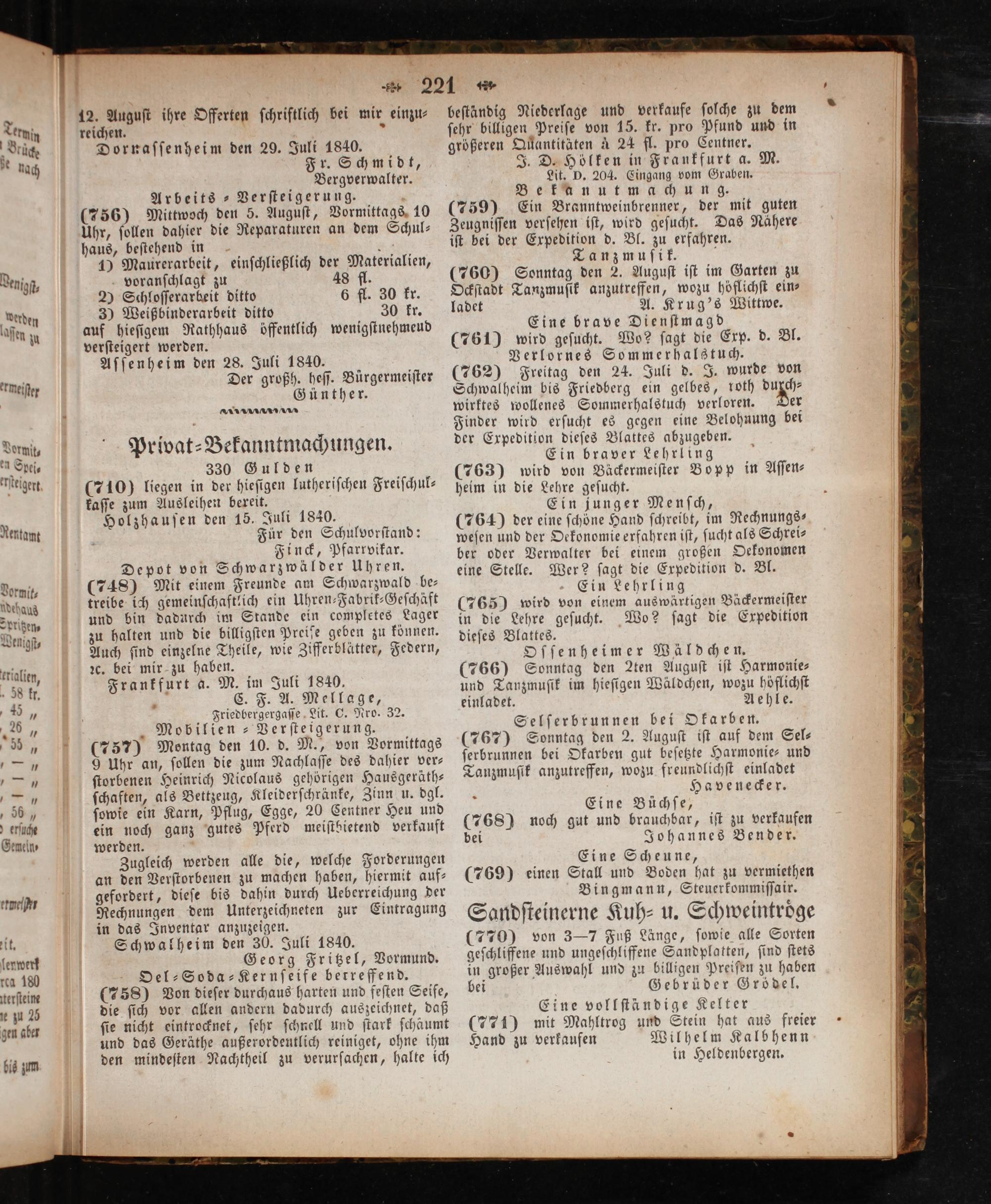 330 Gulden (710) liegen in der hieſigen lutheriſchen Freiſchul⸗ kaſſe zum Ausleihen bereit. Holzhauſen den 15. Juli 1840. Für den Schulvorſtand: Finck, Pfarrvikar.