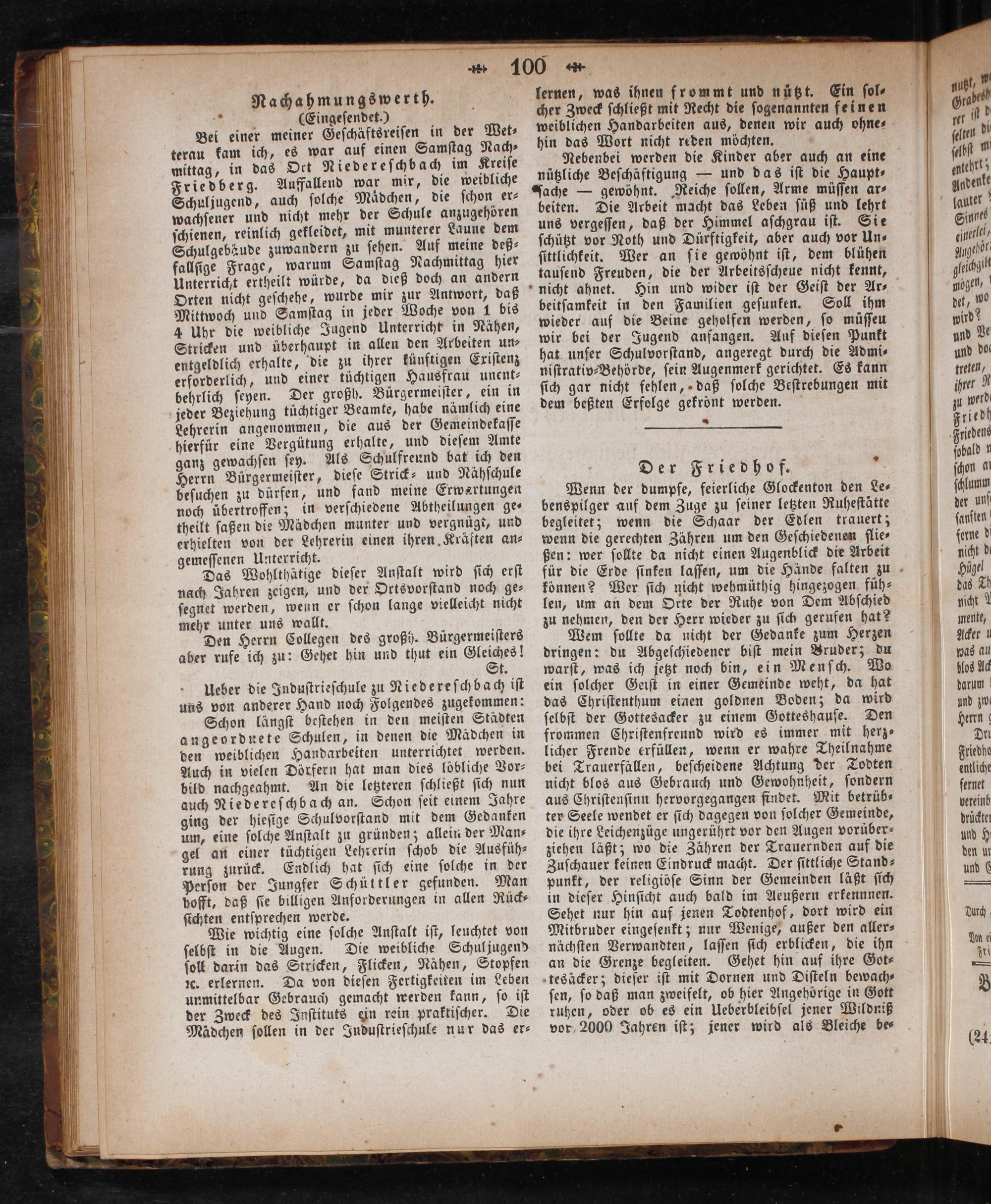 Bei einer meiner Geſchäftsreiſen in der Wet⸗ terau kam ich, es war auf einen Samſtag Nach⸗ mittag, in das Ort Niedereſchbach im Kreiſe Friedberg. Auffallend war mir, die weibliche Schuljugend, auch ſolche Maͤdchen, die ſchon er⸗ wachſener und nicht mehr der Schule anzugehören ſchienen, reinlich gekleidet, mit munterer Laune dem Schulgebäude zuwandern zu ſehen. Auf meine deß⸗ fallſige Frage, warum Samſtag Nachmittag hier Unterricht ertheilt würde, da dieß doch an andern Orten nicht geſchehe, wurde mir zur Antwort, daß Mittwoch und Samſtag in jeder Woche von 1 bis 4 Uhr die weibliche Jugend Unterricht in Nähen, Stricken und überhaupt in allen den Arbeiten un⸗ entgeldlich erhalte, die zu ihrer künftigen Exiſtenz erforderlich, und einer tüchtigen Hausfrau unent⸗ behrlich ſeyen. Der großh. Bürgermeiſter, ein in jeder Beziehung tüchtiger Beamte, habe nämlich eine Lehrerin angenommen, die aus der Gemeindekaſſe hierfür eine Vergütung erhalte, und dieſem Amte ganz gewachſen ſey. Als Schulfreund bat ich den Herrn Bürgermeiſter, dieſe Strick- und Nähſchule beſuchen zu dürfen, und fand meine Erwartungen noch übertroffen; in verſchiedene Abtheilungen ge⸗ theilt ſaßen die Mädchen munter und vergnügt, und erhielten von der Lehrerin einen ihren Kräften an⸗ gemeſſenen Unterricht.