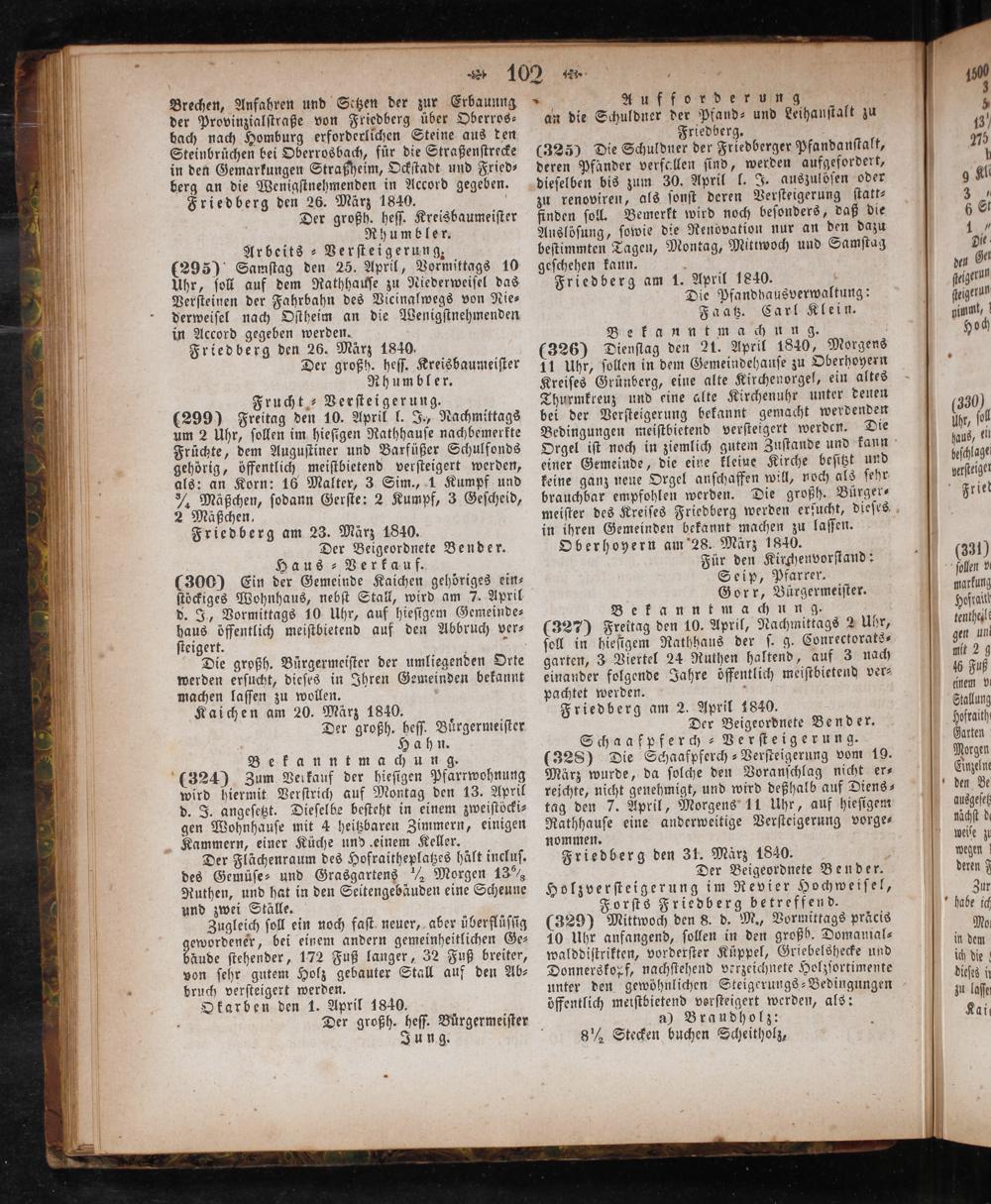 in ihren Gemeinden bekannt machen zu laſſen. Oberhoyern am 28. März 1840. Für den Kirchenvorſtand: Seip, Pfarrer. Gorr, Bürgermeiſter. Bekanntmachung. (327) Freitag den 10. April, Nachmittags 2 Uhr, ſoll in hieſigem Rathhaus der ſ. g. Conrectorats⸗ garten, 3 Viertel 24 Ruthen haltend, auf 3 nach einander folgende Jahre öffentlich meiſtbietend ver⸗ pachtet werden. 5 Friedberg am 2. April 1840.