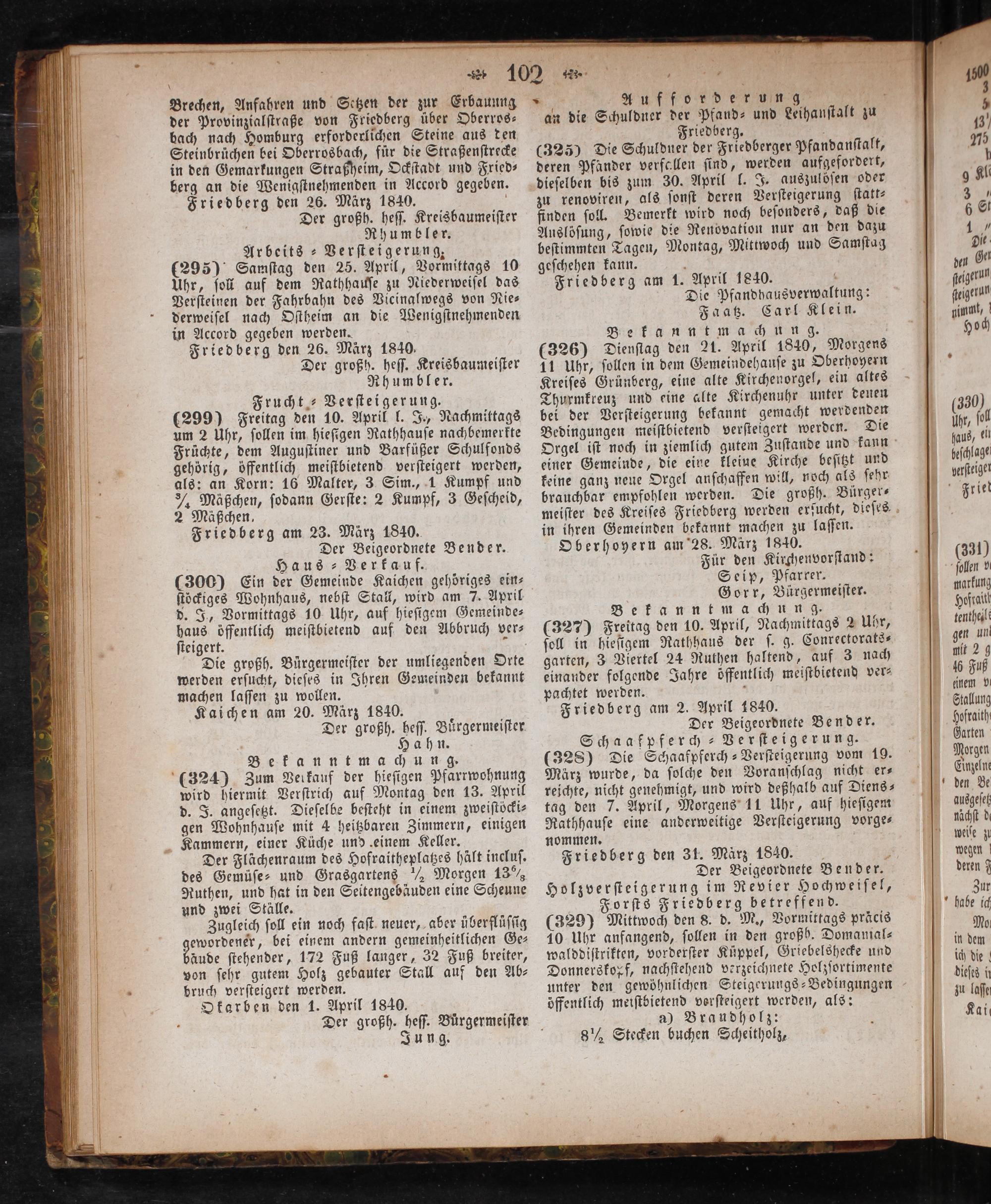 (326) Dienſtag den 21. April 1840, Morgens 11 Uhr, ſollen in dem Gemeindehauſe zu Oberhoyern Kreiſes Grünberg, eine alte Kirchenorgel, ein altes Thurmkreuz und eine alte Kirchenuhr unter denen bei der Verſteigerung bekannt gemacht werdenden Bedingungen meiſtbietend verſteigert werden. Die