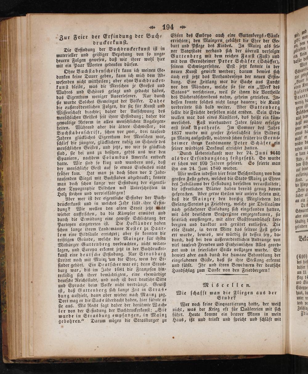 Durch Uebereinkunft war der 24. Juni 1440 als der Erfindungstag feſtgeſetzt. So wurde er ſchon vor 100 Jahren gefeiert. So feierte man ihn am 24. Juni 1840 wieder.