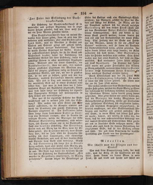Wir wollen indeſſen hier keine Beſchreibung von dem großen Feſte geben, welches die Stadt Mainz zu Ehren des Jubiläums der Erfindung derſelben veranſtaltete; die offentlichen Blätter haben bereits genug davon geſprochen. Aber gerne theilen wir unſern Leſern mit, daß die Mainzer den dreißig Mitgliedern des Geſang-Vereins zu Friedberg, welche zur Theilnahme nach geſchehener Einladung ſich eingefunden hatten, mit ächt deutſchem Bruderſinne entgegenkamen, ſie feierlich empfiengen, mit alter Gaſtfreundſchaft her⸗ bergten und dankbar und gerührt entließen. Die edle Stadt, in deren Mitte das ſeltene Feſt gefei— ert wurde, bewies, wie würdig ſie deſſen ſey, da⸗ durch, daß bei dem außerordentlichen Andrange von viel tauſend Fremden und Einheimiſchen Alles geord— net und in feierlicher Stille vollzogen wurde. Sie bewies aber auch durch die humane Behandlung der eingeladenen Gäſte, daß ſie ihre Stellung erkennt und fühlt. Ihr und ihren Bewehnern der deutſche Handſchlag zum Danke von den Friedbergern!
