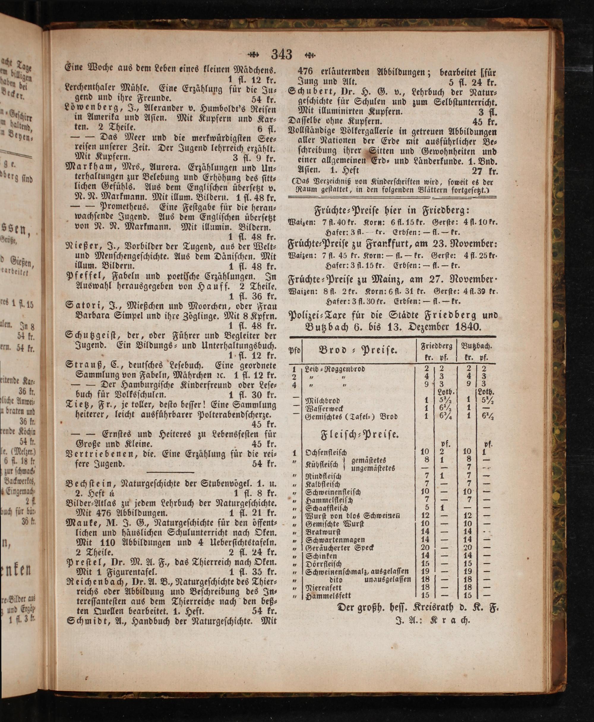 Fruͤchte-Preiſe hier in Friedberg: Waizen: 7 fl. 40 kr. Korn: 6 fl. 15 kr. Gerſte: 4ffl. 10 kr. Hafer: 3 fl.— er. Erbſen:— fl.— kr. Fruͤchte⸗Preiſe zu Frankfurt, am 23. November: Waizen: 7 fl. 45 kr. Korn:— fl.— kr. Gerſte: 4fl. 25 kr. Hafer: 3 fl. 15 r. Erbſen:— fl.— kr. Fruͤchte⸗Preiſe zu Mainz, am 27. November; Waizen: 8 fl. 2er. Korn: 6 fl. 31 kr. Gerſte: 4fl. 39 kr. Hafer: 3 fl. 30 kr. Erbſen:— fl.— kr. Polizei-Taxe fur die Staͤdte Friedberg und Butzbach 6. bis 13. Dezember 1840.