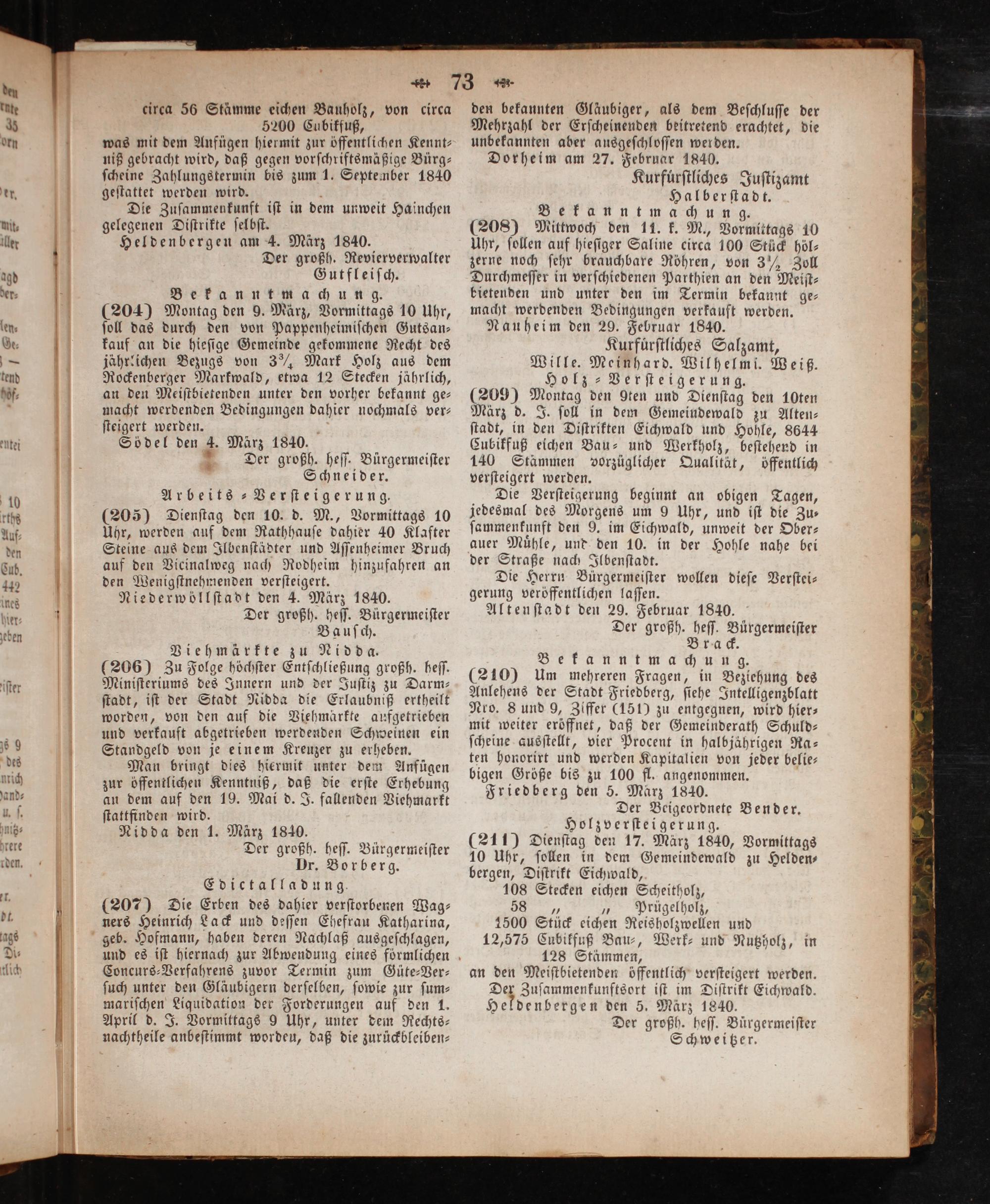 den bekannten Gläubiger, als dem Beſchluſſe der Mehrzahl der Erſcheinenden beitretend erachtet, die unbekannten aber ausgeſchloſſen werden. Dorheim am 27. Februar 1840. Kurfuͤrſtliches Juſtizamt Halberſtadt. Bekanntmachung. (208) Mittwoch den 11. k. M., Vormittags 10 Uhr, ſollen auf hieſiger Saline circa 100 Stück höl⸗ zerne noch ſehr brauchbare Röhren, von 3 ½ Zoll Durchmeſſer in verſchiedenen Parthien an den Meiſt⸗ bietenden und unter den im Termin bekannt ge⸗ macht werdenden Bedingungen verkauft werden. Nauheim den 29. Februar 1840. Kurfuͤrſtliches Salzamt, Wille. Meinhard. Wilhelmi. Weiß. Holz ⸗Verſteigerung. (209) Montag den gten und Dienſtag den 10ten März d. J. ſoll in dem Gemeindewald zu Alten⸗ ſtadt, in den Diſtrikten Eichwald und Hohle, 8644 Cubikfuß eichen Bau- und Werkholz, beſtehend in 140 Stammen vorzüglicher Qualität, öffentlich verſteigert werden.