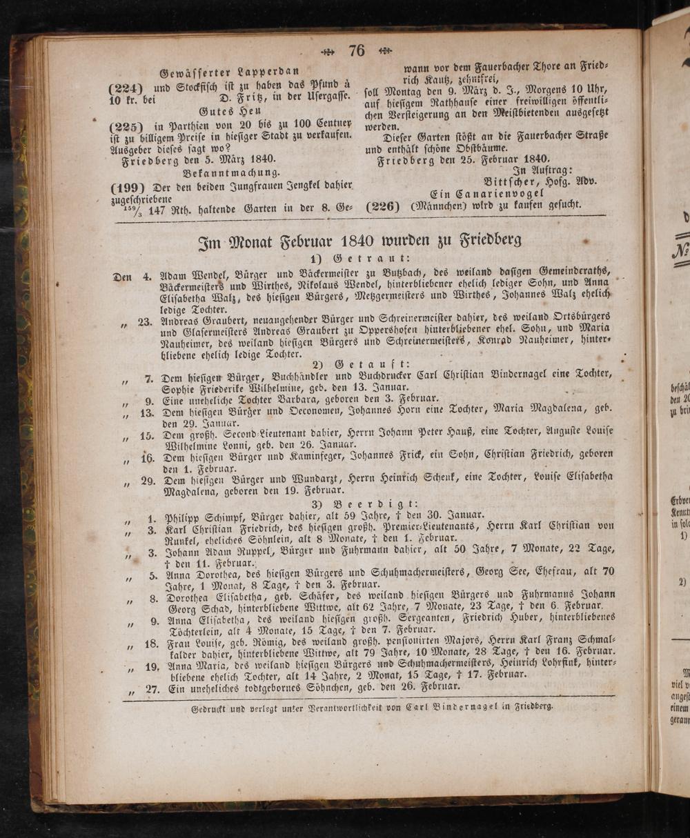 Im Monat Februar 1840 wurden zu Friedberg 4 5 1) Getrau t: N und Bäckermeiſter zu Butzbach, des weiland daſigen Gemeinderaths
