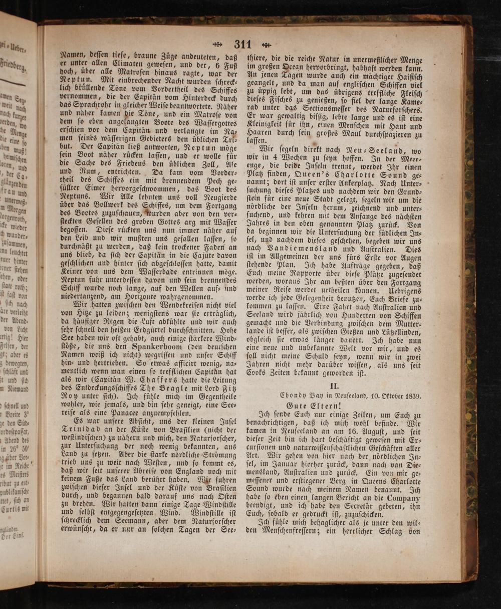 Ich ſende Euch nur einige Zeilen, um Euch zu benachrichtigen, daß ich mich wohl befinde. Wir kamen in Neuſeeland an am 16. Auguſt, und ſeit dieſer Zeit bin ich hart beſchäftigt geweſen mit Ex— curſionen und naturwiſſenſchaftlichen Geſchäften aller Art. Wir gehen von hier nach der nördlichen In— ſel, im Januar hierher zurück, dann nach van Die— mensland, Auſtralien und zurück. Ein von mir ge⸗ meſſener und erſtiegener Berg in Queens Charlotte Sound wurde nach meinem Namen benannt. Ich habe ſo eben einen langen Bericht an die Company beendigt, und ich habe den Secretär gebeten, ihn Euch, ſobald er gedruckt iſt, zuzuſchicken.