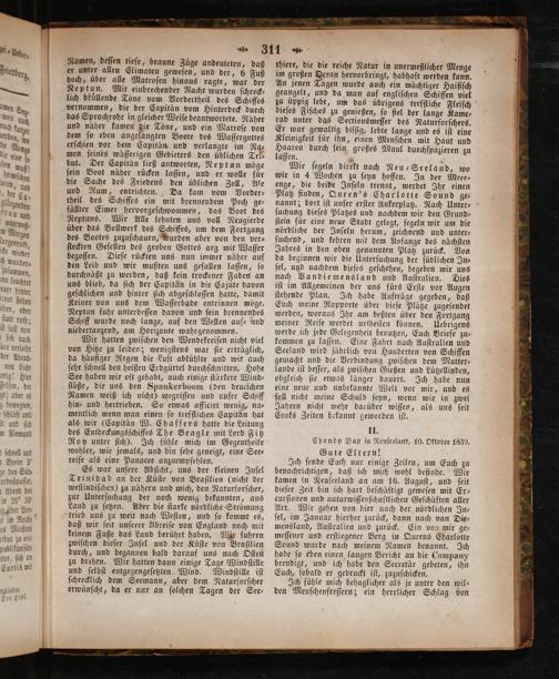 Es war unſere Abſicht, uns der kleinen Inſel Trinidad an der Kuſte von Braſilien(nicht der weſtindiſchen) zu nähern und mich, den Naturforſcher, zur Unterſuchung der noch wenig bekannten, ans Land zu ſetzen. Aber die ſtarke nördliche Strömung trieb uns zu weit nach Weſten, und ſo kommt es, daß wir ſeit unſerer Abreiſe von England noch mit keinem Fuße das Land berührt haben. Wir fuhren zwiſchen dieſer Inſel und der Küſte von Braſilien durch, und begannen bald darauf uns nach Oſten zu drehen. Wir hatten dann einige Tage Windſtille und ſelbſt entgegengeſetzten Wind. Windſtille iſt ſchrecklich dem Seemann, aber dem Naturforſcher erwünſcht, da er nur an ſolchen Tagen der See—