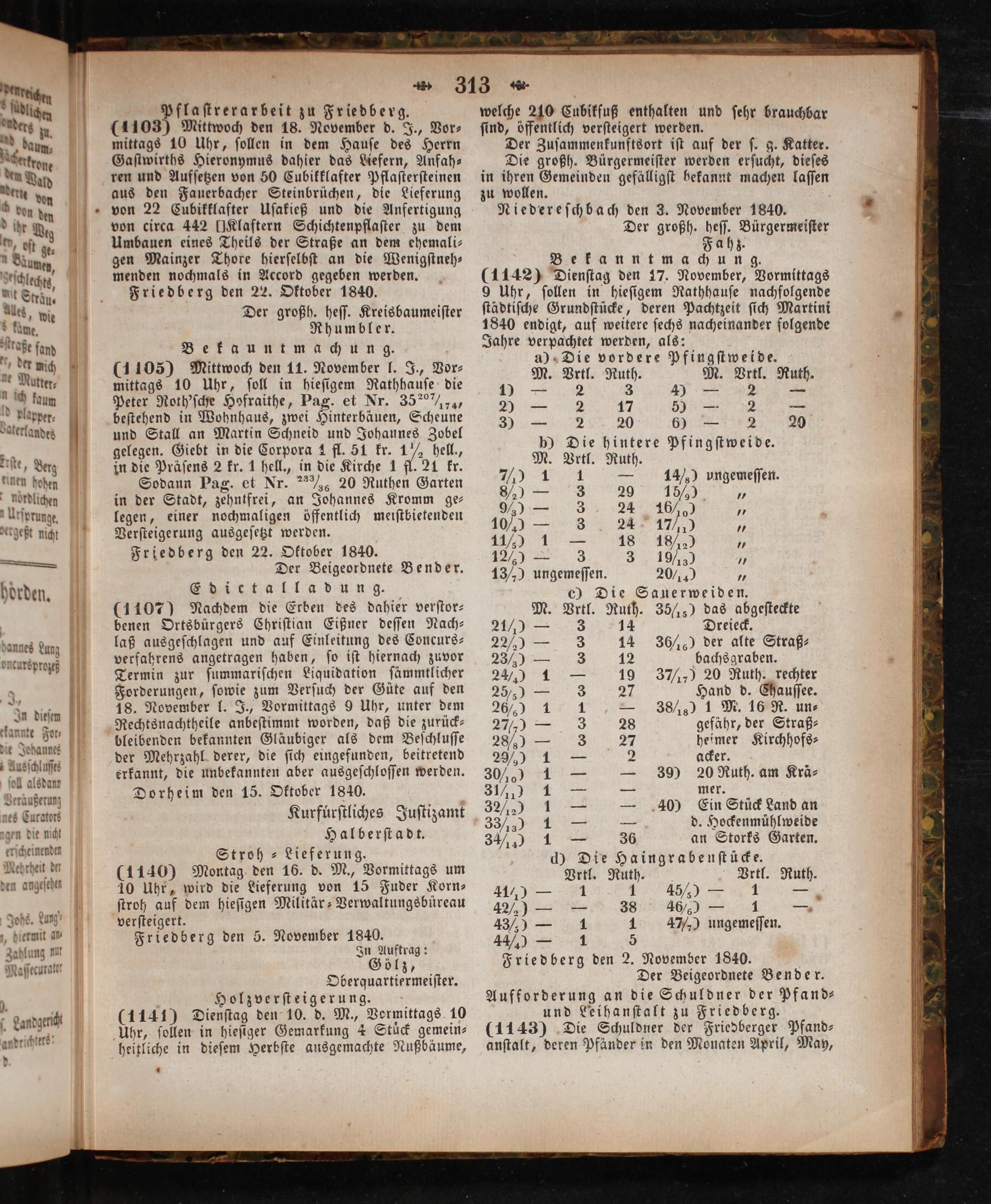 welche 210 Cubikfuß enthalten und ſehr brauchbar ſind, öffentlich verſteigert werden. Der Zuſammenkunftsort iſt auf der ſ. g. Katter. Die großh. Bürgermeiſter werden erſucht, dieſes in ihren Gemeinden gefälligſt bekannt machen laſſen zu wollen. Niedereſchbach den 3. November 1840. Der großh. heſſ. Burgermeiſter Fahz. Bekanntmachung. (1142) Dienſtag den 17. November, Vormittags 9 Uhr, ſollen in hieſigem Rathhauſe nachfolgende ſtädtiſche Grundſtücke, deren Pachtzeit ſich Martini 1840 endigt, auf weitere ſechs nacheinander folgende Jahre verpachtet werden, als: a) Die vordere Pfingſtweide. M. Vrtl. Ruth. M. Vrtl. Ruth.