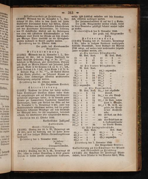 Friedberg den 2. November 1840. Der Beigeordnete Bender. Aufforderung an die Schuldner der Pfand-⸗ und Leihanſtalt zu Friedberg. (1143) Die Schuldner der Friedberger Pfand⸗ anſtalt, deren Pfänder in den Monaten April, May,