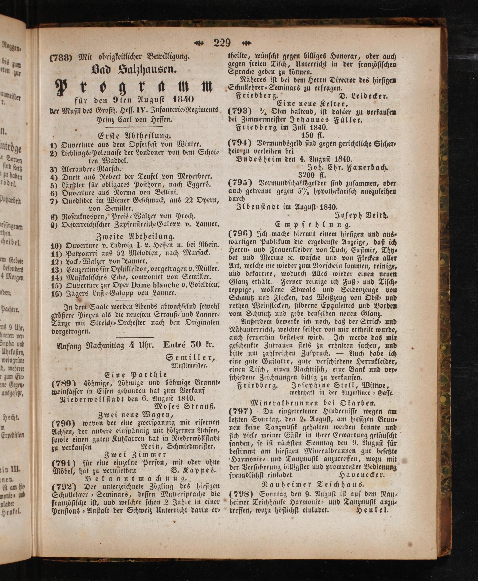Semiller, Muſikmeiſter. Eine Parthie (789) aöhmige, 2öbhmige und löhmige Brannt⸗ weinfäſſer in Eiſen gebunden hat zum Verkauf Niederwöllſtadt den 6. Auguſt 1840. Moſes Strauß. Zwei neue Wagen, (790) wovon der eine zweiſpännig mit eiſernen Achſen, der andere einſpännig mit hölzernen Achſen, ſowie einen guten Kühkarren hat in Niederwöllſtadt zu verkaufen Reitz, Schmiedmeiſter. Zwei Zimmer (791) für eine einzelne Perſon, mit oder ohne Möbel, hat zu vermiethen B. Kappes. Bekannimachun g. (792) Der unterzeichnete Zögling des hieſigen Schullehrer Seminars, deſſen Mutterſprache die franzöſiſche iſt, und welcher ſchon 2 Jahre in einer Penſions⸗Anſtalt der Schweiz Unterricht darin er⸗