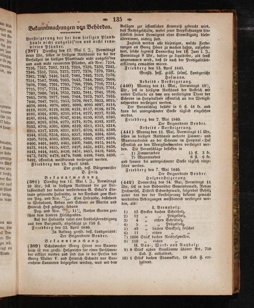 8034, 8044, 8076, 8082, 8089, 8095 8097, 8114, 8119, 8128, 8129, 8130, 8132, 8157, 8159, 8178, 8181, 8201, 8202, 8210, 8214, 8222, 8227, 8230, 8241, 8244, 8246, 8247, 8248, 8250, 8258, 8260, 8261, 8263, 8264, 8272, 8274, 8278, 8283, 8287, 8293, 8296, 8305, 8308, 8310, 8312, 8313, 8314, 8315, 8317, 8320, 8321, 8322, 8329, 8335, 8340, 8344, 8353, 8354, 8355, 8357, 8360, 8364, 8366, 8368, 8378, 8385, 8390, 8392, 8393, 8397, 8399, 8400, 8401, 8402, 8405, 8406, 8408, 8415, 8416, 8423, 8424, 8425, 8427, 8428, 8431, 8432, 8438, 8443, 8444, 8445, 8450, 8451, 8455, 8459, 8468, 8473, 8476, 8478, 8479, 8480, 8488, 8489, 8490, 8492, öffentlich meiſtbietend verſteigert werden. Friedberg den 23. April 1840. Der großh. heſſ. Buͤrgermeiſter D. Fritz.