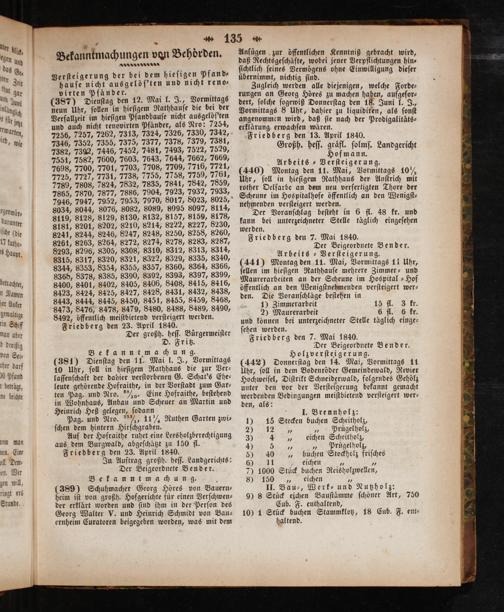 Friedberg den 7. Mai 1840. Der Beigeordnete Bender. Arbeits-Verſteigerung. (441) Montag den 11. Mai, Vormittags 11 Uhr, ſellen im hieſigen Rathhauſe mehrere Zimmer- und Maurerarbeiten an der Scheune im Hospital-Hof öffentlich an den Wenigſtnehmenden verſteigert wer- den. Die Voranſchläge beſtehen in 1) Zimmerarbeit 13 fl. 8 kr 2) Maurerarbeit 6 fl. 6 kr. und können bei unterzeichneter Stelle täglich einge— ſehen werden. Friedberg den 7. Mai 1840. Der Beigeordnete Bender. Holzverſteigerung. (442) Donnerſtag den 14. Mai, Vormittags 11 Uhr, ſoll in dem Bodenröder Gemeindewald, Revier Hochweiſel, Diſtrikt Schneiderwald, folgendes Gehölz unter den vor der Verſteigerung bekannt gemacht werdenden Bedingungen meiſtbietend verſteigert wer— den, als: I. Brennholz: 1) 15 Stecken buchen Scheitholz,