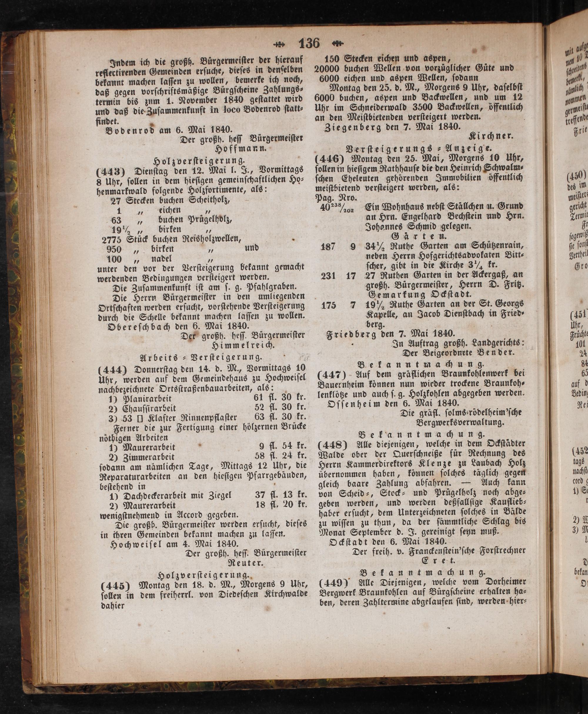 Ferner die zur Fertigung einer hölzernen Brücke noͤthigen Arbeiten 1) Maurerarbeit 9 fl. 54 kr. 2 Zimmerarbeit 58 fl. 24 kr. ſodann am nämlichen Tage, Mittags 12 Uhr, die Reparaturarbeiten an den hieſigen Pfarrgebäuden, beſtehend in a 1) Dachdeckerarbeit mit Ziegel 37 fl. 13 kr. 2) Maurerarbeit 18 fl. 20 kr. wenigſtnehmend in Accord gegeben. Die großb. Bürgermeiſter werden erſucht, dieſes in ihren Gemeinden bekannt machen zu laſſen. Hochweiſel am 4. Mai 1840. Der großh. heſſ. Bürgermeiſter Reuter. Holzverſteigerung. (445) Montag den 18. d. M., Morgens 9 Uhr, ſollen in dem freiherrl. von Diedeſchen Kirchwalde dahier