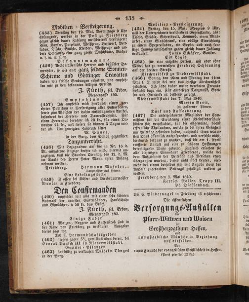 Nie derwöllſtadt den 7. Mai 1840. 0 Martin Breit, . im goldenen Löwen. Dank und Aufforderung. (467) Die unterzeichneten Mitglieder der Com⸗ miſſion für die Errichtung einer Kleinkinderſchule fühlen ſich verpflichtet, für die allgemeine, höchſt erfreuliche Theilnahme, welche ſie bei ihren Geſuchen um Beiträge gefunden haben, nochmals ihren wärm⸗ ſten Dank öffentlich auszuſprechen, und verfehle nicht, hierdurch bekannt zu machen, daß die am 1. April eröffnete Anſtalt auf eine zu ſchönen Hoffnungen berechtigende Weiſe gedeiht. Zugleich erſuchen ſie alle diejenigen Einwohner Friedbergs, welche bei dem Aufzeichnen der Beiträge aus Verſehen etwa übergangen wurden, dieſes nicht übel deuten, viel⸗ mehr bei einem derſelben ſich mit Angabe ihres der Anſtalt zugedachten Beitrags gefälligſt melden zu wollen. Friedberg den 7. Mai 1840. Fertſch. Roller. Trapp III. Ph. Dieffenbach.