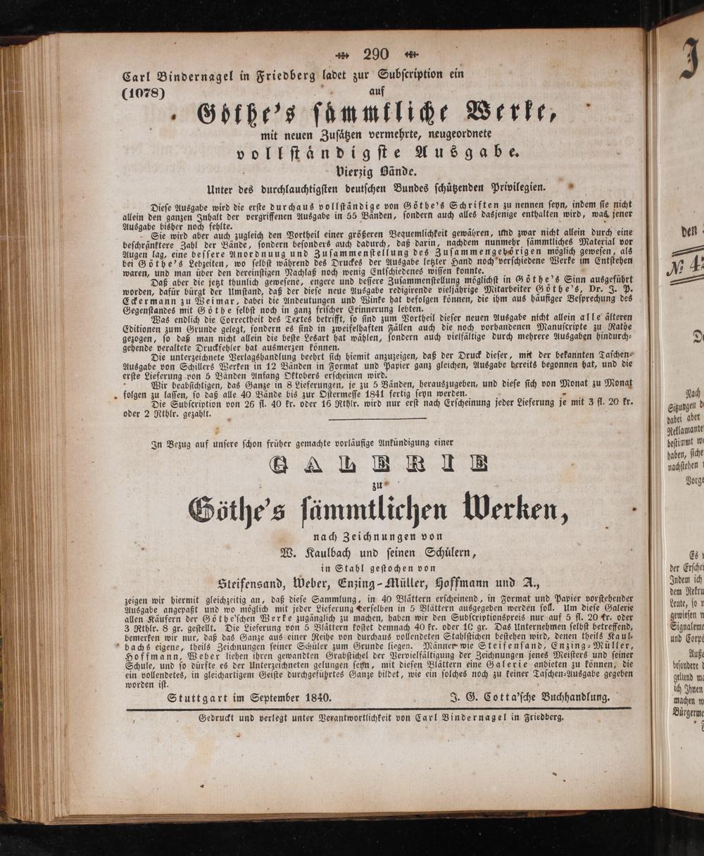 , 290 Carl Bindernagel in Friedberg ladet zur Subſcription ein (1078) 9 auf 1 5 „Göthe's ſämmtliche Werle, mit neuen Zuſaͤtzen vermehrte, neugeordnete voll ſtaͤn dig ſte Ausgabe. 58 N vierzig Vände. Unter des durchlauchtigſten deutſchen Bundes ſchützenden Privilegien. 9