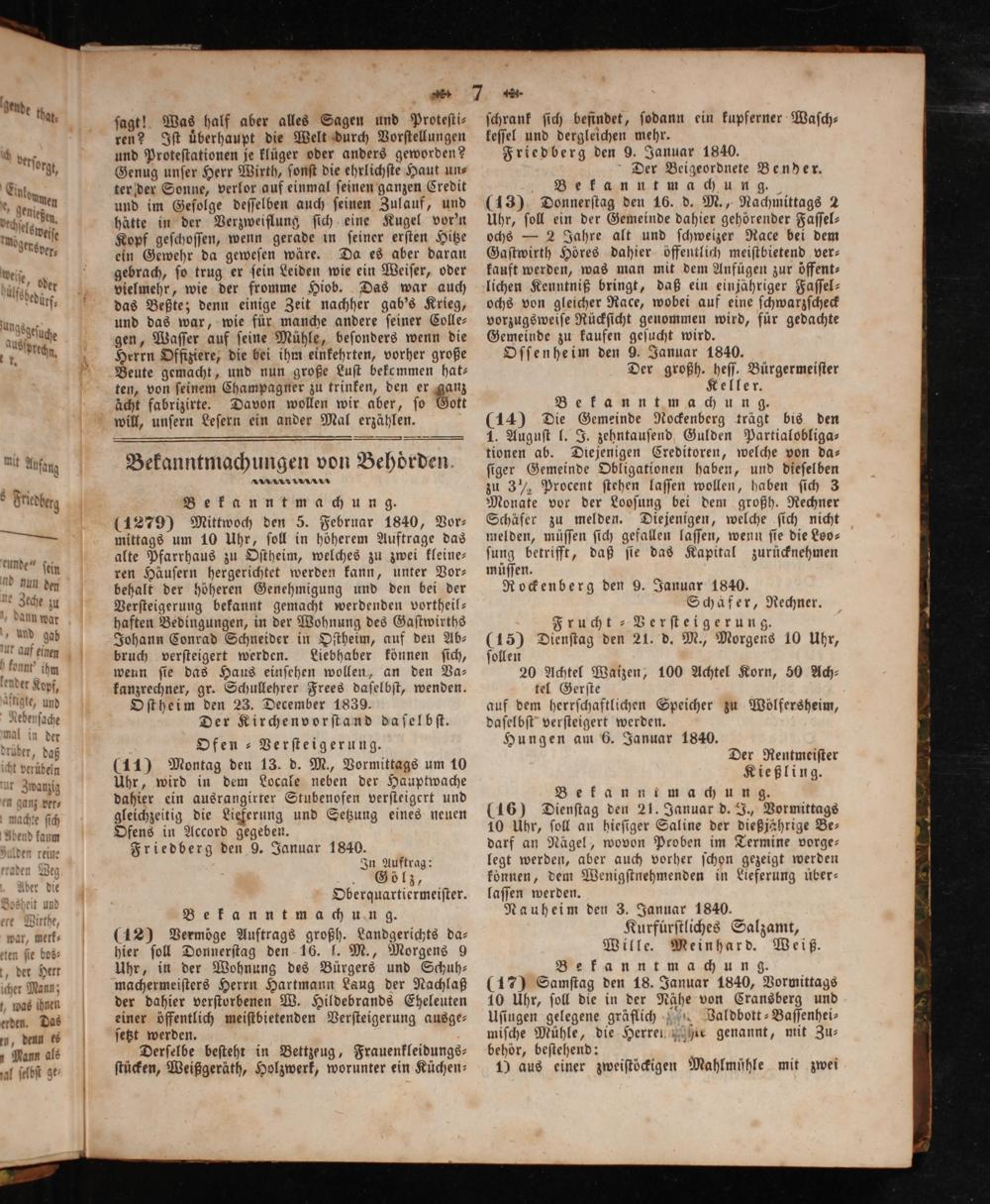 ſchrank ſich befindet, ſodann ein kupferner Waſch— keſſel und dergleichen mehr. Friedberg den 9. Januar 1840. Der Beigeordnete Bender. Bekannt mach unn g. (13) Donnerſtag den 16. d. M., Nachmittags 2 Uhr, ſoll ein der Gemeinde dahier gehörender Faſſel— ochs— 2 Jahre alt und ſchweizer Race bei dem Gaſtwirth Höres dahier öffentlich meiſtbietend ver— kauft werden, was man mit dem Anfügen zur öffent⸗ lichen Kenntniß bringt, daß ein einjähriger Faſſel⸗ ochs von gleicher Race, wobei auf eine ſchwarzſcheck vorzugsweiſe Rückſicht genommen wird, für gedachte Gemeinde zu kaufen geſucht wird. Oſſenheim den 9. Januar 1840. Der großh. heſſ. Bürgermeiſter Keller. Bekanntmachung. (14) Die Gemeinde Nockenberg trägt bis den 1. Auguſt l. J. zehntauſend Gulden Partialobliga⸗ tionen ab. Diejenigen Creditoren, welche von da⸗ ſiger Gemeinde Obligationen haben, und dieſelben zu 3¼ Procent ſtehen laſſen wollen, haben ſich 3 Monate vor der Looſung bei dem großh. Rechner Schäfer zu melden. Diejenigen, welche ſich nicht melden, müſſen ſich gefallen laſſen, wenn ſie die Loo— ſung betrifft, daß ſie das Kapital zurücknehmen müſſen. Rockenberg den 9. Januar 1840. Schäfer, Rechner. Frucht ⸗Verſteigerung. (15) Dienſtag den 21. d. M., Morgens 10 Uhr, ſollen 20 Achtel Waizen, 100 Achtel Korn, 50 Ach⸗ tel Gerſte auf dem herrſchaftlichen Speicher zu Wölfersheim, daſelbſt verſteigert werden. Hungen am 6. Januar 1840. Der Rentmeiſter Kießling. Bekanntmachung. (16) Dienſtag den 21. Januar d. J., Vormittags 10 Uhr, ſoll an hieſiger Saline der dießjahrige Be⸗ darf an Nägel, wovon Proben im Termine vorge— legt werden, aber auch vorher ſchon gezeigt werden können, dem Wenigſtnehmenden in Lieferung über— laſſen werden. Nauheim deu 3. Januar 1840. Kurfüͤrſtliches Salzamt, Wille. Meinhard. Weiß.