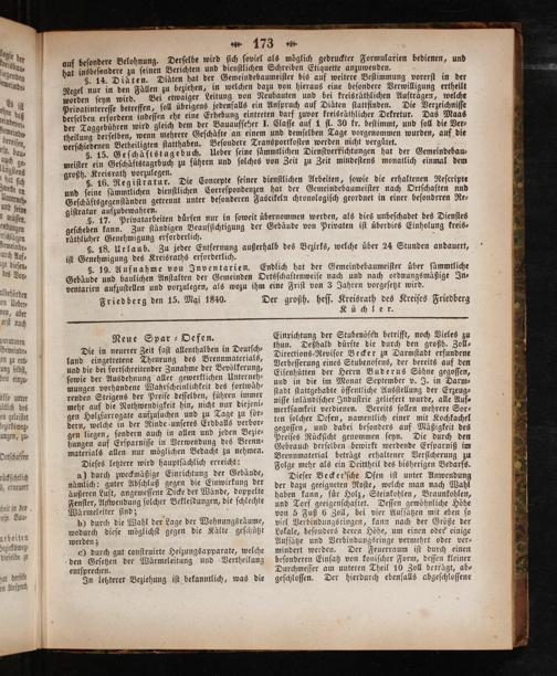 Einrichtung der Stubenöfen betrifft, noch Vieles zu thun. Deßhalb dürfte die durch den großh. Zoll⸗ Directions-Reviſor Becker zu Darmſtadt erfundene Verbeſſerung eines Stubenofens, der bereits auf den Eiſenhütten der Herrn Buderus Söhne gegoſſen, und in die im Monat September v. J. in Darm⸗ ſtadt ſtattgehabte öffentliche Ausſtellung der Erzeug⸗ niſſe inländiſcher Induſtrie geliefert wurde, alle Auf⸗ merkſamkeit verdienen. Bereits ſollen mehrere Sor⸗ ten ſolcher Oefen, namentlich einer mit Kochkachel gegoſſen, und dabei beſonders auf Mäßigkeit des Preiſes Rückſicht genommen ſeyn. Die durch den Gebrauch derſelben bewirkt werdende Erſparniß im Brennmaterial beträgt erhaltener Verſicherung zu Folge mehr als ein Drittheil des bisherigen Bedarfs.
