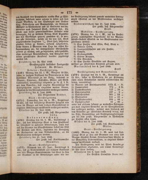 rich Reinhard von Pappenheim ererbte Gut zu Wöl⸗ ſersheim, beſtehend unter andern in ſieben und drei Quart Markholz in den Waldungen von Rocken⸗ berg, Bellersheim und Muſchenheim, an Reinhard Muͤnzner in Wölfersheim und 11 Conſorten von da, worunter auch Johannes Stoll, verkauft hat. Da jedoch aus dieſer gemeinſchaftlichen Urkunde nicht hervorgeht, bis zu welchem Betrag Stoll Eigenthü⸗ mer des Markholzes quaest. geworden iſt, ſo wer⸗ den alle diejenigen, welche an die von Joh. Stoll angeſprochenen fraglichen/ Pferd Holz Anſprüche glauben bilden zu können, andurch aufgefordert, ſolche binnen 3 Monaten vom Tage der erſten Be⸗ kanntmachung an, bei unterzeichneter Gerichtsſtelle geltend zu machen, und zu begründen, widrigenfalls, ohne vorheriges Präcluſivdecret, dem Steigerer der⸗ ſelben gerichtlichen Kaufbrief darüber zugefertigt werden ſoll. Friedberg den 20. Mai 1840. Großherzoglich heſſiſches Landgericht Hofmann. Dr. Gilmer.