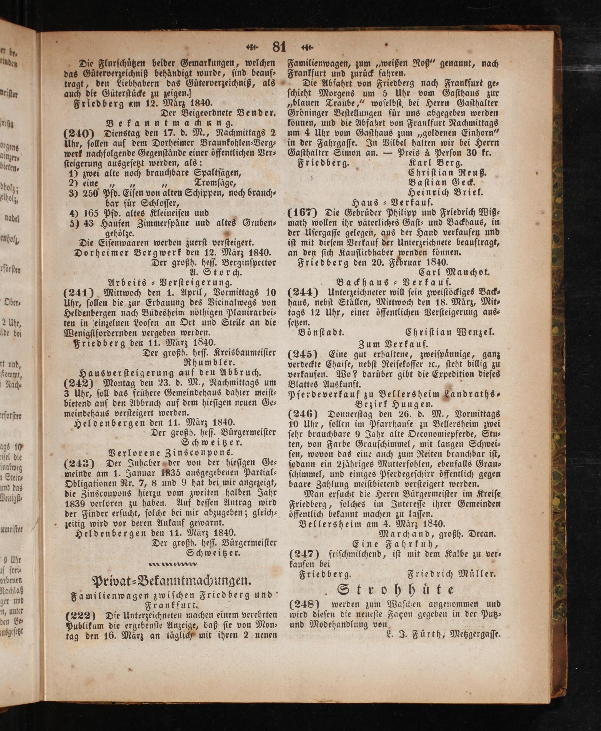 das Güterverzeichniß behändigt wurde, ſind beauf⸗ tragt, den Liebhabern das Guͤterverzeichniß, als auch die Güterſtücke zu zeigen.] Friedberg em 12. Maͤrz 1840. Der Beigeordnete Bender. Bekanntmachung. (240) Dienstag den 17. d. M., Nachmittags 2 Uhr, ſollen auf dem Dorheimer Braunkohlen-Berg⸗ werk nachfolgende Gegenſtände einer öffentlichen Ver⸗ ſteigerung ausgeſetzt werden, als: 1 zwei alte noch brauchbare Spaltſägen, R 55 Tromſäge, 3) 250 Pfd. Eiſen von alten Schippen, noch brauch⸗ bar für Schloſſer, 4 165 Pfd. altes Kleineiſen und 5) 43 Haufen Zimmerſpäne und altes Gruben⸗ gehölze.* Die Eiſenwaaren werden zuerſt verſteigert. Dorheimer Bergwerk den 12. März 1840. Der großh. heſſ. Berginſpector A. Storch. Arbeits-Verſteigerung. (241) Mittwoch den 1. April, Vormittags 10 Uhr, ſollen die zur Erbauung des Vicinalwegs von Heldenbergen nach Büdesheim nöthigen Planirarbei⸗ ten in einzelnen Looſen an Ort und Stelle an die Wenigſtfordernden vergeben werden. Friedberg den 11. März 1840. Der großh. heſſ. Kreis baumeiſter Rhumbler. Hausverſteigerung auf den Abbruch. (242) Montag den 23. d. M., Nachmittags um 3 Uhr, ſoll das frühere Gemeindehaus dahier meiſt— bietend auf den Abbruch auf dem hieſigen neuen Ge⸗ meindehaus verſteigert werden. Heldenbergen den 11. März 1840. Der großh. heſſ. Bürgermeiſter Schweitzer. Verlorene Zinscoupons. (243) Der Inhaber der von der hieſigen Ge⸗ meinde am 1. Januar 1835 ausgegebenen Partial— Obligationen Nr. 7, 8 und 9 hat bei mir angezeigt, die Zinscoupons hierzu vom zweiten halben Jahr 1839 verloren zu haben. Auf deſſen Antrag wird der Finder erſucht, ſolche bei mir abzugeben; gleich— jeitig wird vor deren Ankauf gewarnt. Heldenbergen den 11. März 1840. Der großh. heſſ. Bürgermeiſter Schweitzer.