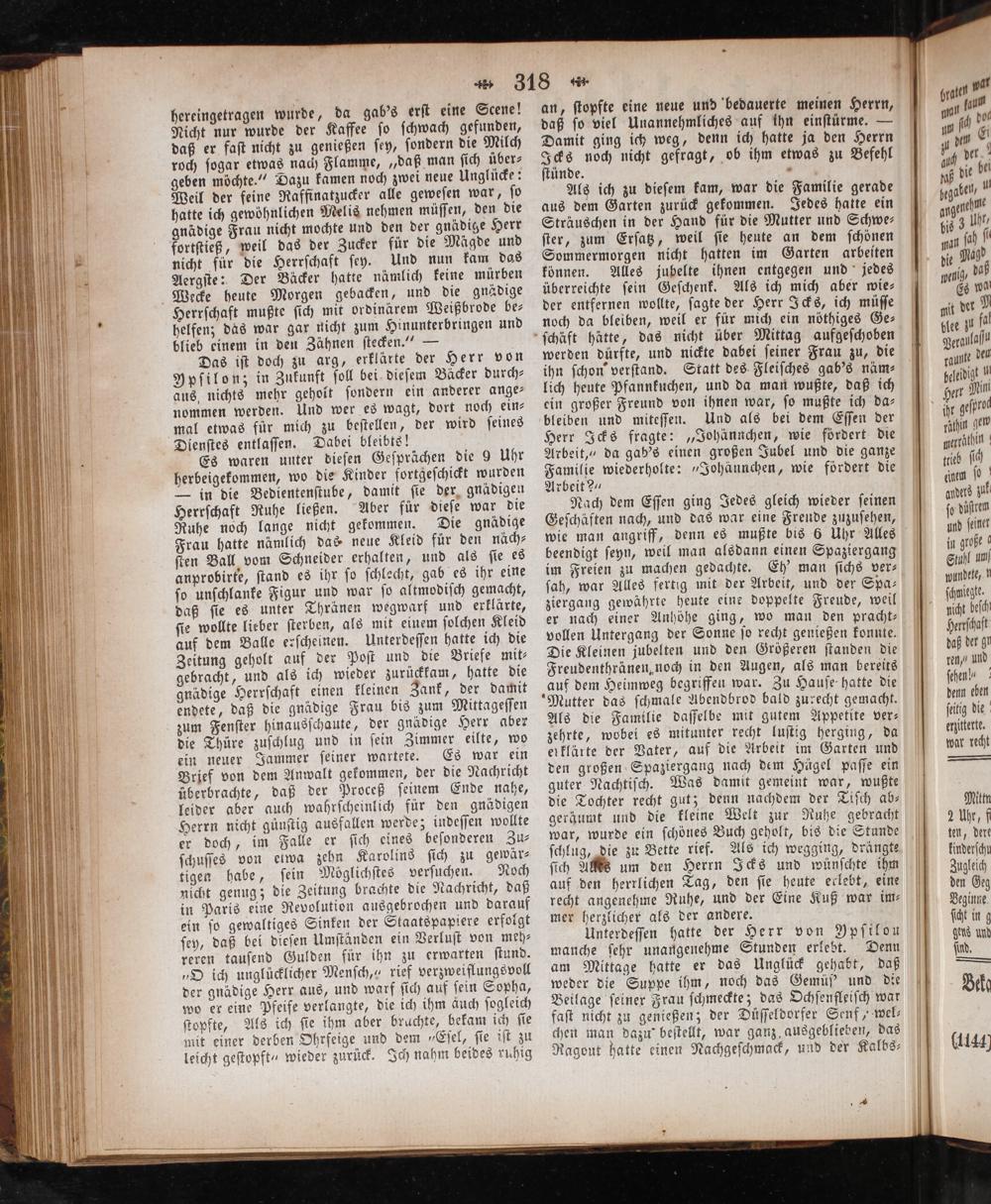 Unterdeſſen hatte der Herr von Ypſilou manche ſehr unangenehme Stunden erlebt. Denn am Mittage hatte er das Unglück gehabt, daß weder die Suppe ihm, noch das Gemüß' und die Beilage ſeiner Frau ſchmeckte; das Ochſenfleiſch war faſt nicht zu genießen; der Duͤſſeldorfer Senf, wel; chen man dazu' beſtellt, war ganz, ausgeblieben, das Ragout hatte einen Nachgeſchmack, und der Kalbs⸗