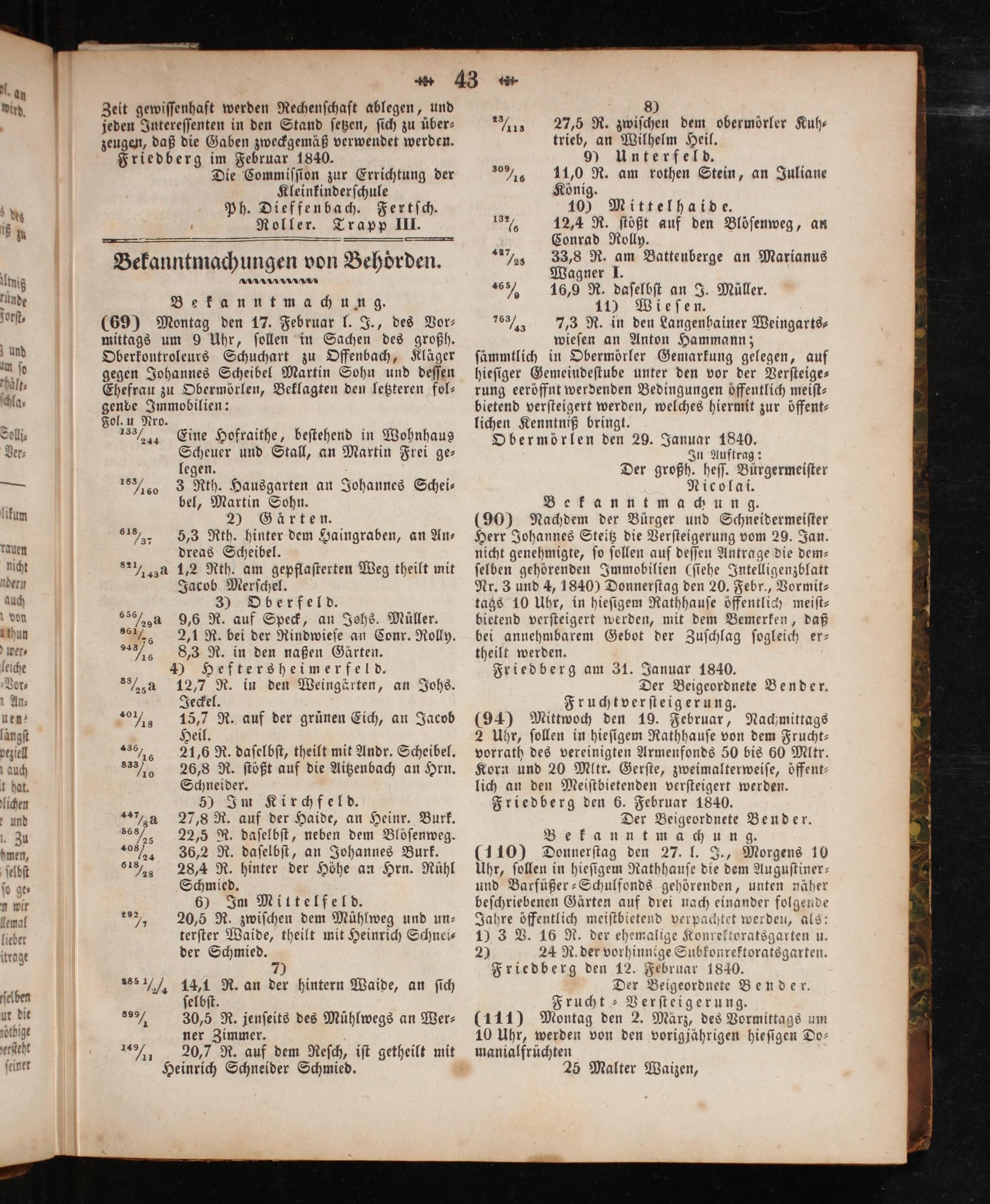80 27,5 R. zwiſchen dem obermörler Kuh— trieb, an Wilhelm Heil. 9) ͤ Unterfeld. 0%; 11,0 R. am rothen Stein, an Juliane König. 10) Mittelhaide. 3 60 12,4 R. ſtößt auf den Blöſenweg, an Conrad Rolly. % 33,8 R. am Battenberge an Marianus Wagner J. 1 16,9 R. daſelbſt an J. Müller. 11) Wieſen. 76% 7,3 R. in den Langenhainer Weingarts⸗ wieſen an Anton Hammann; ſämmtlich in Obermörler Gemarkung gelegen, auf hieſiger Gemeindeſtube unter den vor der Verſteige— rung eeröffnt werdenden Bedingungen öffentlich meiſt— bietend verſteigert werden, welches hiermit zur öffent— lichen Kenntniß bringt. Obermörlen den 29. Januar 1840. In Auftrag: Der großh. heſſ. Bürgermeiſter Nicolai. Bekanntmachung. (90) Nachdem der Bürger und Schneidermeiſter Herr Johannes Steitz die Verſteigerung vom 29. Jan. nicht genehmigte, ſo ſollen auf deſſen Antrage die dem— ſelben gehörenden Immobilien(ſiehe Intelligenzblatt Nr. 3 und 4, 1840) Donnerſtag den 20. Febr., Vormit⸗ tags 10 Uhr, in hieſigem Rathhauſe öffentlich meiſt— bietend verſteigert werden, mit dem Bemerken, daß bei annehmbarem Gebot der Zuſchlag ſogleich er— theilt werden. Friedberg am 31. Januar 1840. Der Beigeordnete Bender. Fruchtverſteigerung. (94) Mittwoch den 19. Februar, Nachmittags 2 Uhr, ſollen in hieſigem Rathhauſe von dem Frucht— vorrath des vereinigten Armenfonds 50 bis 60 Mltr. Korn und 20 Mltr. Gerſte, zweimalterweiſe, öffent— lich an den Meiſtbietenden verſteigert werden. Friedberg den 6. Februar 1840. Der Beigeordnete Bender. Be kannt machung. (110) Donnerſtag den 27. l. J., Morgens 10 Uhr, ſollen in hieſigem Rathhauſe die dem Auguſtiner— und Barfüßer-Schulfonds gehörenden, unten näher beſchriebenen Gärten auf drei nach einander folgende Jahre öffentlich meiſtbietend verpachtet werden, als: 19 3 V. 16 R. der ehemalige Konrektoratsgarten u. 2 24 R. der vorhinnige Subkonrektoratsgarten. Friedberg den 12. Februar 1840. Der Beigeordnete Bender. Frucht ⸗Verſteigerung. (111) Montag den 2. Marz, des Vormittags um 10 Uhr, werden von den vorigjährigen hieſigen Do— manialfrüchten 25 Malter Waizen,